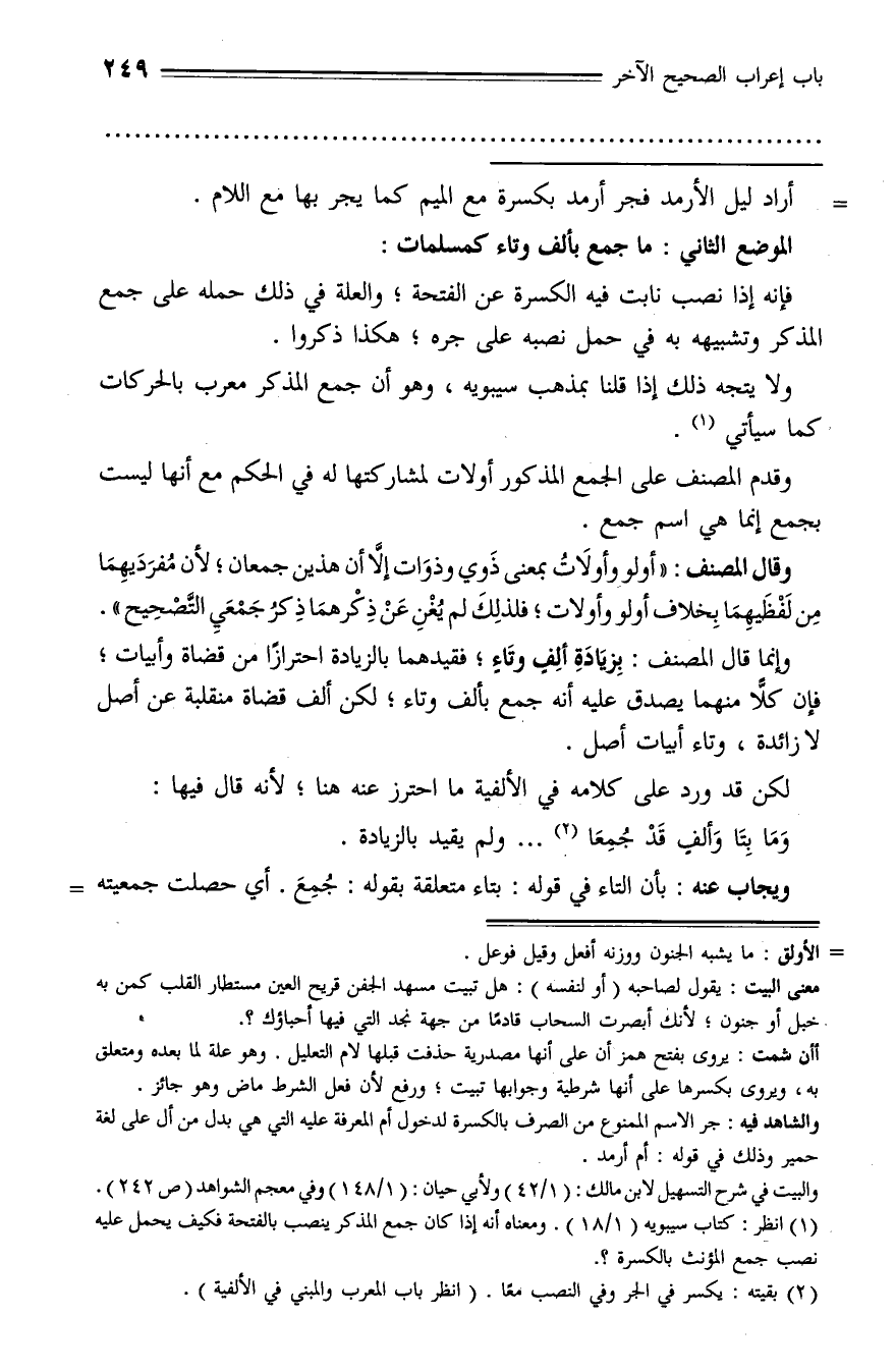 (¬1) انظر: كتاب سيبويه (1/ 18). ومعناه أنه إذا كان جمع المذكر ينصب بالفتحة فكيف يحمل عليه نصب جمع المؤنث بالكسرة؟.