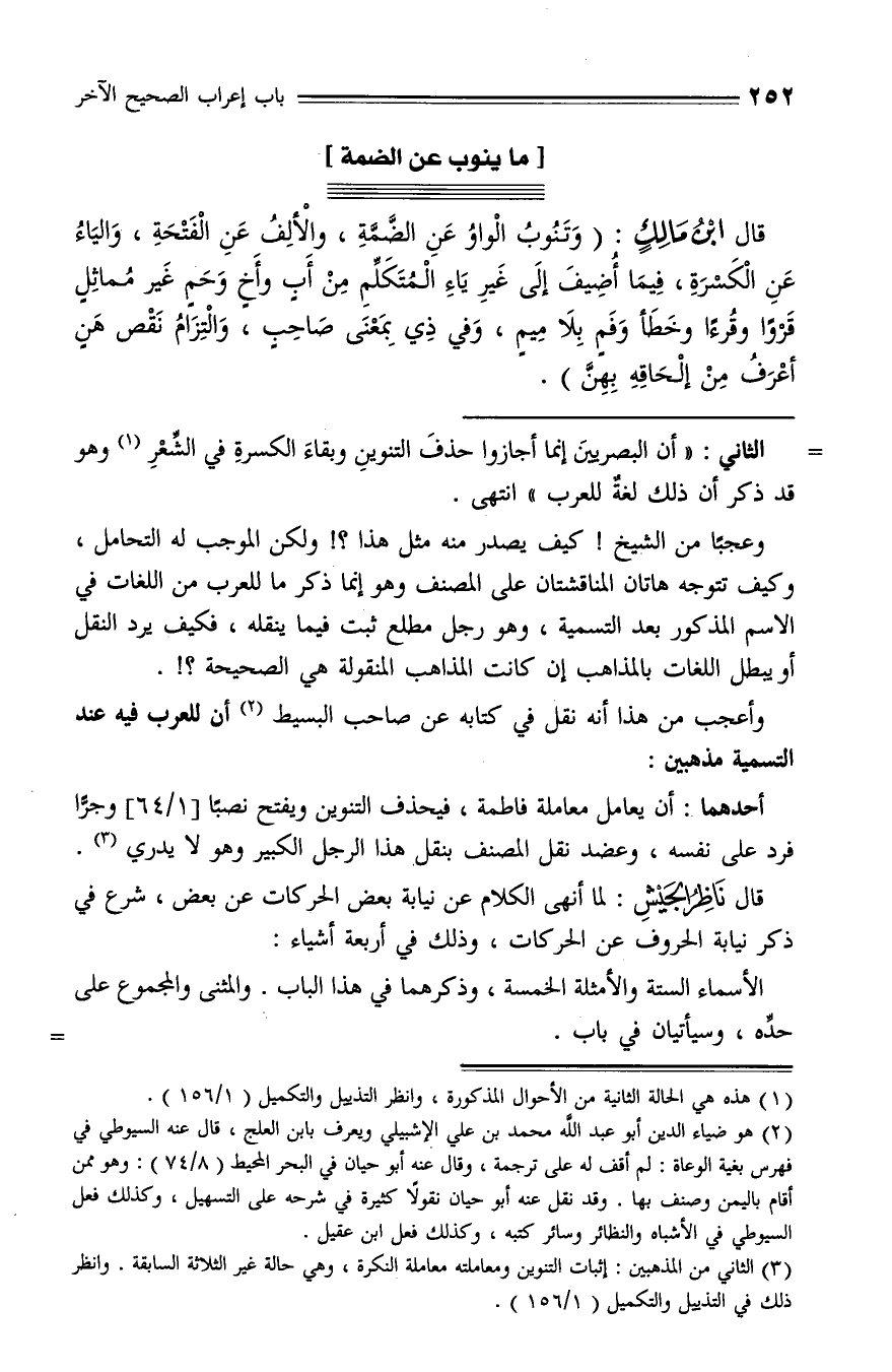 (¬3) الثاني من المذهبين: إثبات التنوين ومعاملته معاملة النكرة، وهي حالة غير الثلاثة السابقة. وانظر ذلك في التذييل والتكميل (1/ 156).