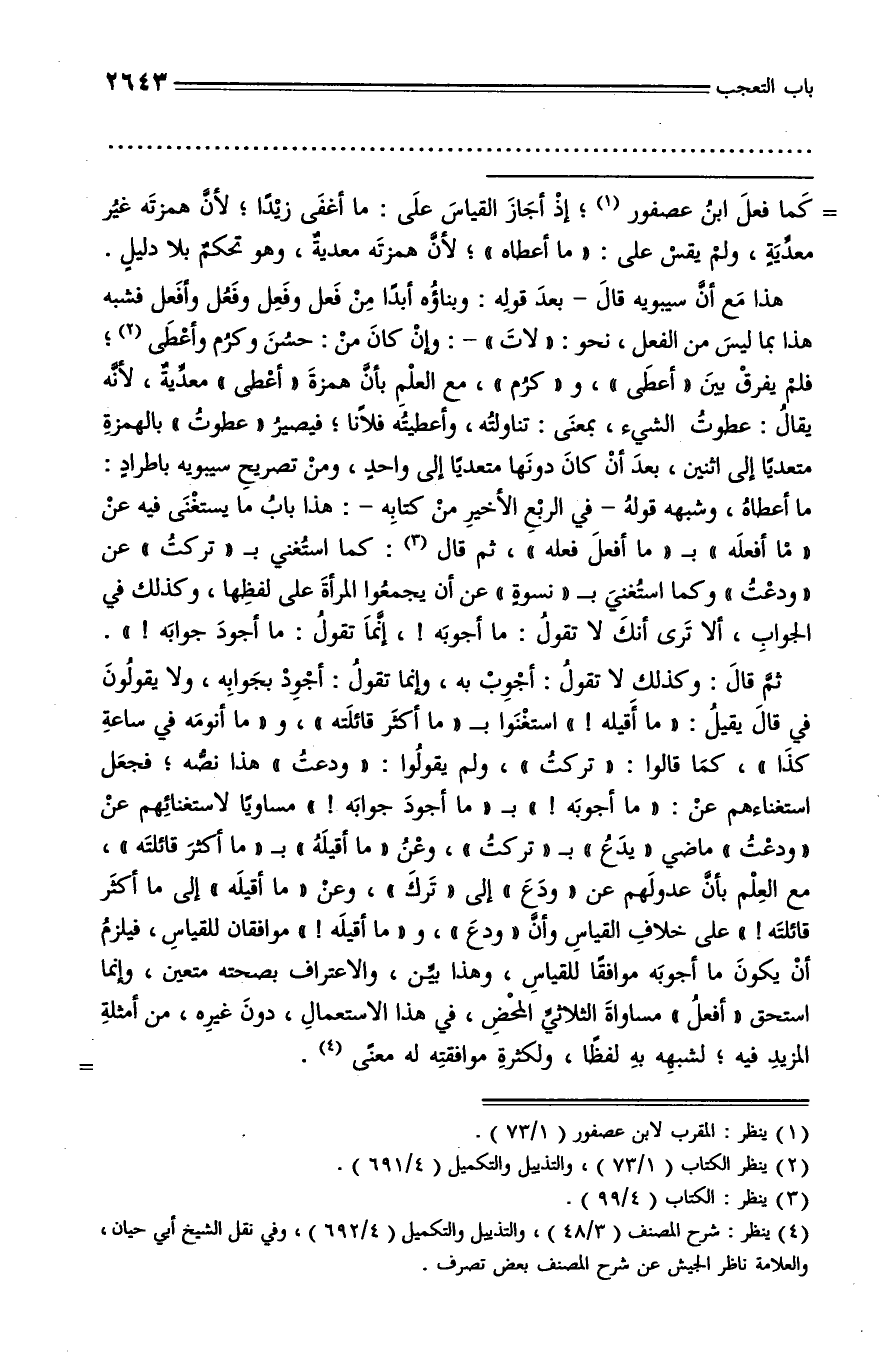 هذا مع أنّ سيبويه قال - بعد قوله: وبناؤه أبدا من فعل وفعل وفعل وأفعل فشبه هذا بما ليس من الفعل، نحو: «لات» -: وإن كان من: حسن وكرم وأعطى (¬2)؛ فلم يفرق بين «أعطى»، و «كرم»، مع العلم بأنّ همزة «أعطى» معدّية، لأنّه يقال: عطوت الشيء، بمعنى: تناولته، وأعطيته فلانا؛ فيصير «عطوت» بالهمزة متعديا إلى اثنين، بعد أن كان دونها متعديا إلى واحد، ومن تصريح سيبويه باطراد: