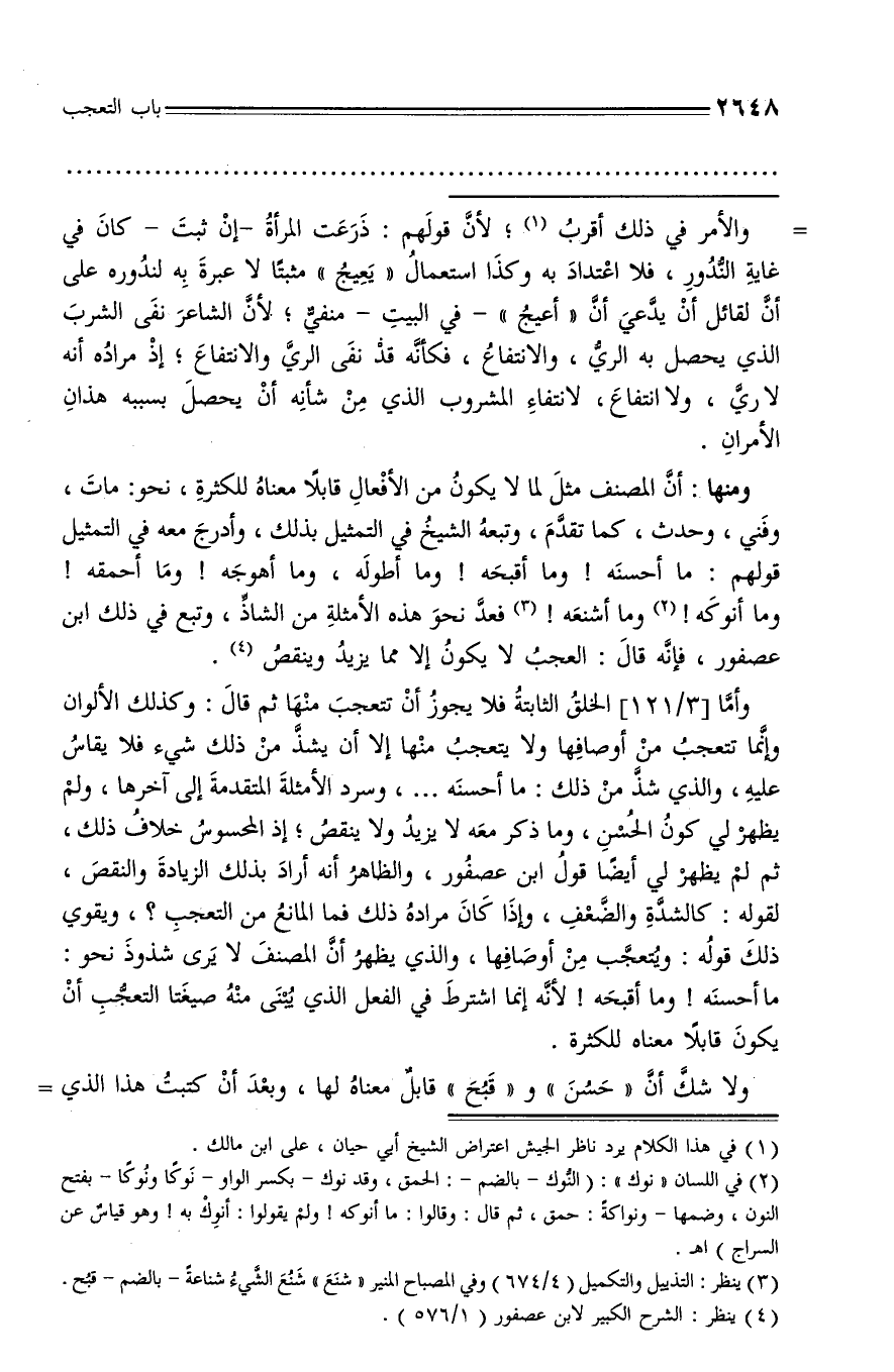 ومنها: أنّ المصنف مثل لما لا يكون من الأفعال قابلا معناه للكثرة، نحو: مات، وفني، وحدث، كما تقدّم، وتبعه الشيخ في التمثيل بذلك، وأدرج معه في التمثيل قولهم: ما أحسنه! وما أقبحه! وما أطوله، وما أهوجه! وما أحمقه! وما أنوكه! (¬2) وما أشنعه! (¬3) فعدّ نحو هذه الأمثلة من الشاذّ، وتبع في ذلك ابن عصفور، فإنّه قال: العجب لا يكون إلا مما يزيد وينقص (¬4).