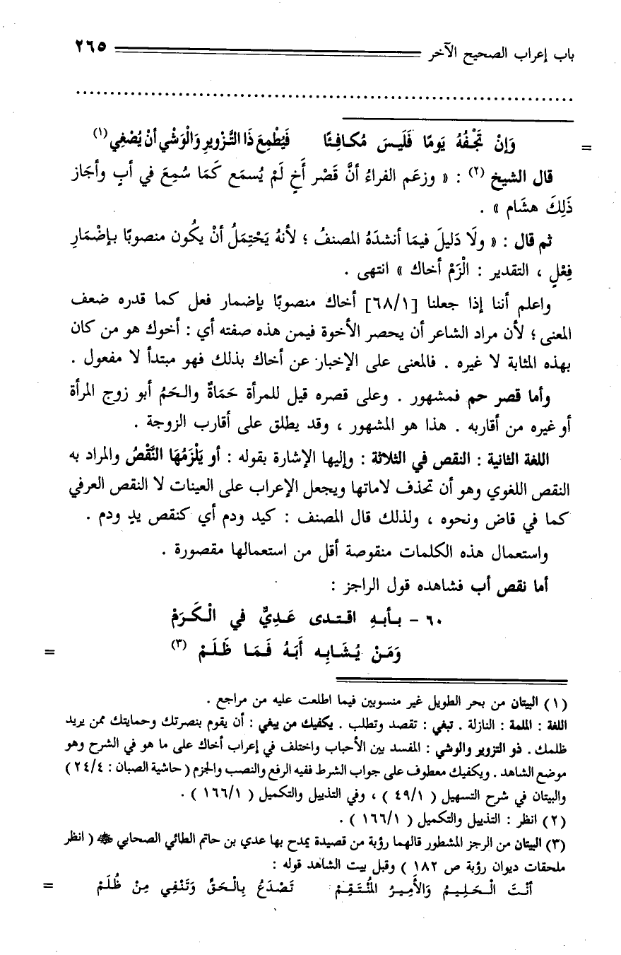 اللغة: الملمة: النازلة. تبغي: تقصد وتطلب. يكفيك من يبغي: أن يقوم بنصرتك وحمايتك ممن يريد ظلمك. ذو التزوير والوشي: المفسد بين الأحباب واختلف في إعراب أخاك على ما هو في الشرح وهو موضع الشاهد. ويكفيك معطوف على جواب الشرط ففيه الرفع والنصب والجزم (حاشية الصبان: 4/ 24) والبيتان في شرح التسهيل (1/ 49)، وفي التذييل والتكميل (1/ 166).