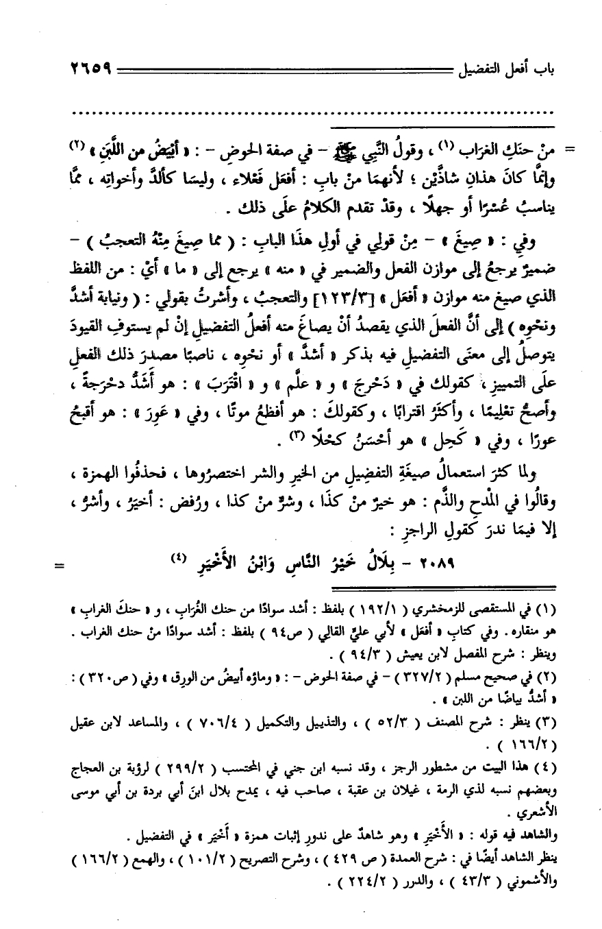من حنك الغراب (¬1)، وقول النّبي صلّى الله عليه وسلّم - في صفة الحوض -: «أبيض من اللّبن» (¬2) وإنّما كان هذان شاذّين؛ لأنهما من باب: أفعل فعلاء، وليسا كألدّ وأخواته، ممّا يناسب عسرا أو جهلا، وقد تقدم الكلام على ذلك.