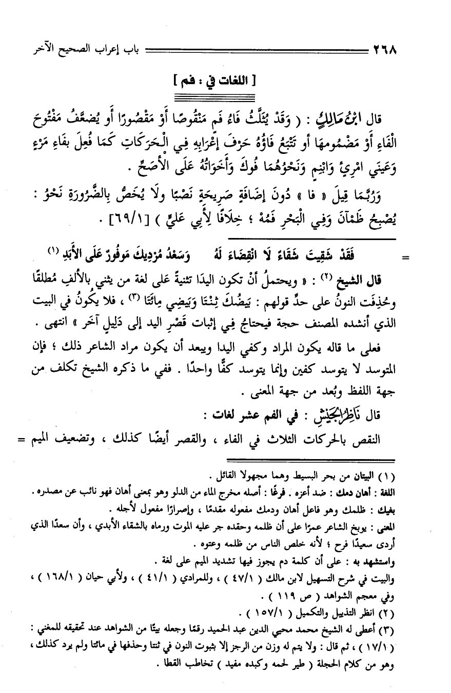قال ابن مالك: (وقد يثلّث فاء فم منقوصا أو مقصورا أو يضعّف مفتوح الفاء أو مضمومها أو تتبع فاؤه حرف إعرابه في الحركات كما فعل بفاء مرء وعيني امرئ وابنم ونحوهما فوك وأخواته على الأصحّ.