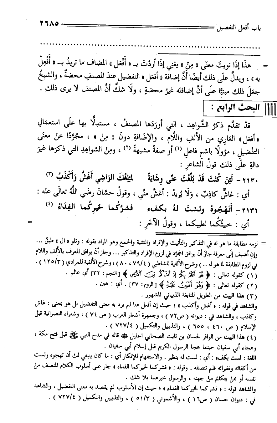حيث إن الأسلوب لم يقصد به معنى التفضيل، والشاهد في: ديوان حسان (ص 16)، والأشموني (3/ 51)، والتذييل والتكميل (4/ 727).