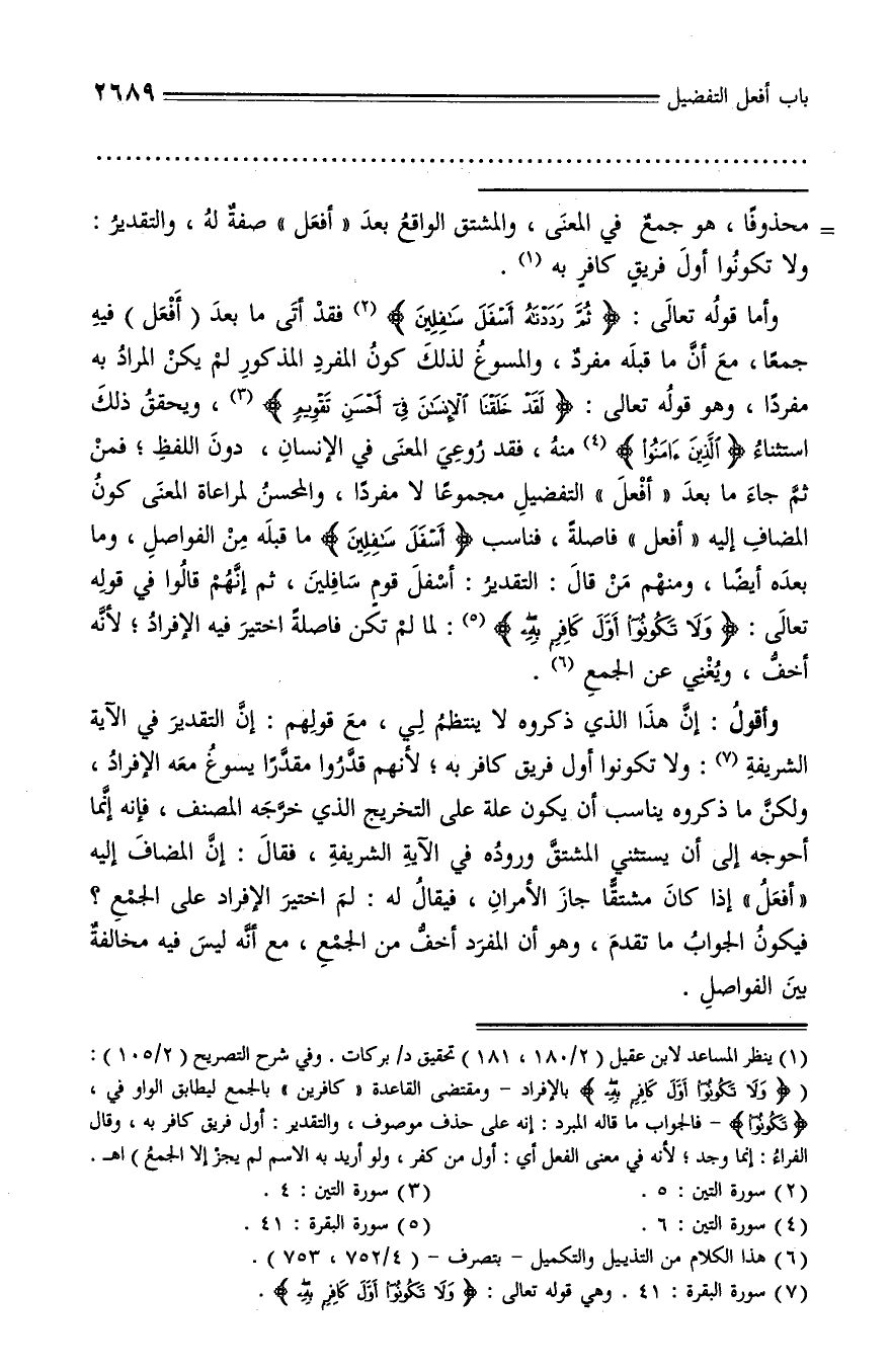 وأما قوله تعالى: ثُمَّ رَدَدْناهُ أَسْفَلَ سافِلِينَ (¬2) فقد أتى ما بعد (أفعل) فيه جمعا، مع أنّ ما قبله مفرد، والمسوغ لذلك كون المفرد المذكور لم يكن المراد به مفردا، وهو قوله تعالى: لَقَدْ خَلَقْنَا الْإِنْسانَ فِي أَحْسَنِ تَقْوِيمٍ (¬3)، ويحقق ذلك استثناء الَّذِينَ آمَنُوا (¬4) منه، فقد روعي المعنى في الإنسان، دون اللفظ؛ فمن ثمّ جاء ما بعد «أفعل» التفضيل مجموعا لا مفردا، والمحسن لمراعاة المعنى كون المضاف إليه «أفعل» فاصلة، فناسب أَسْفَلَ سافِلِينَ ما قبله من الفواصل، وما بعده أيضا، ومنهم من قال: التقدير: أسفل قوم سافلين، ثم إنّهم قالوا في قوله تعالى: وَلا تَكُونُوا أَوَّلَ كافِرٍ بِهِ (¬5): لما لم تكن فاصلة اختير فيه الإفراد؛ لأنّه أخفّ، ويغني عن الجمع (¬6).
