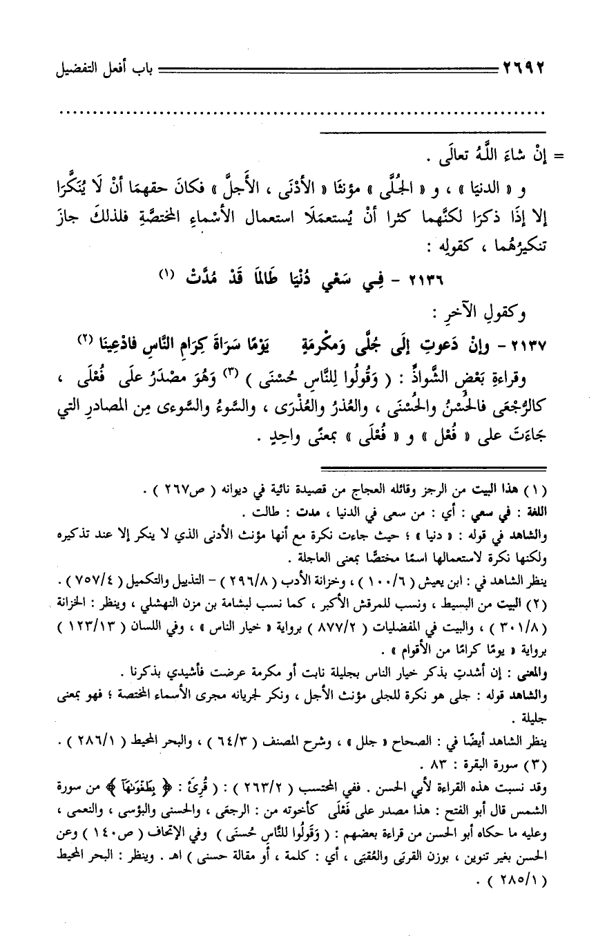 وقراءة بعض الشّواذّ: (وقولوا للنّاس حسنى) (¬3) وهو مصدر على فعلى، كالرّجعى فالحسن والحسنى، والعذر والعذرى، والسّوء والسّوءى من المصادر التي جاءت على «فعل» و «فعلى» بمعنى واحد.