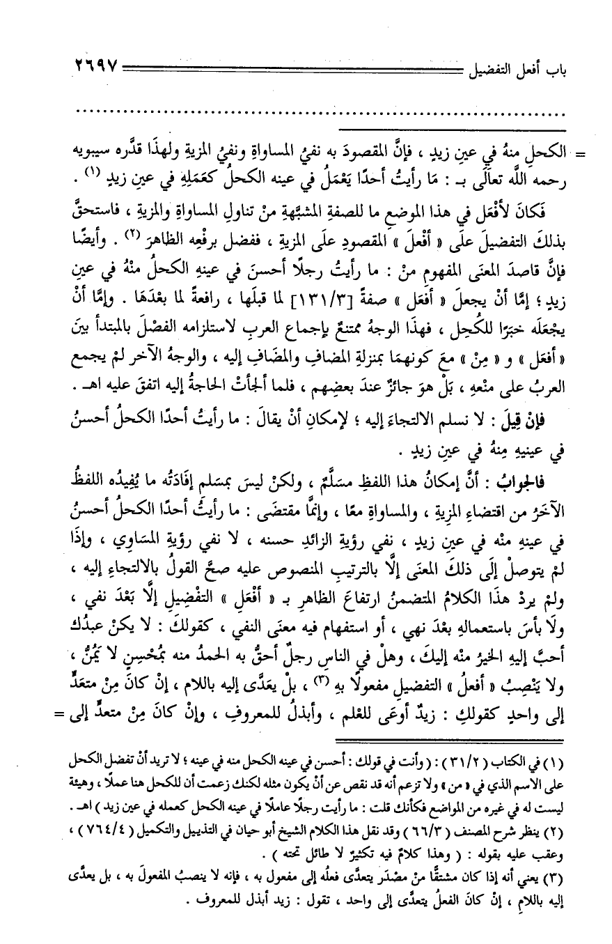 (¬1) في الكتاب (2/ 31): (وأنت في قولك: أحسن في عينه الكحل منه في عينه؛ لا تريد أن تفضل الكحل على الاسم الذي في «من» ولا تزعم أنه قد نقص عن أن يكون مثله لكنك زعمت أن للكحل هنا عملا، وهيئة ليست له في غيره من المواضع فكأنك قلت: ما رأيت رجلا عاملا في عينه الكحل كعمله في عين زيد) اهـ.