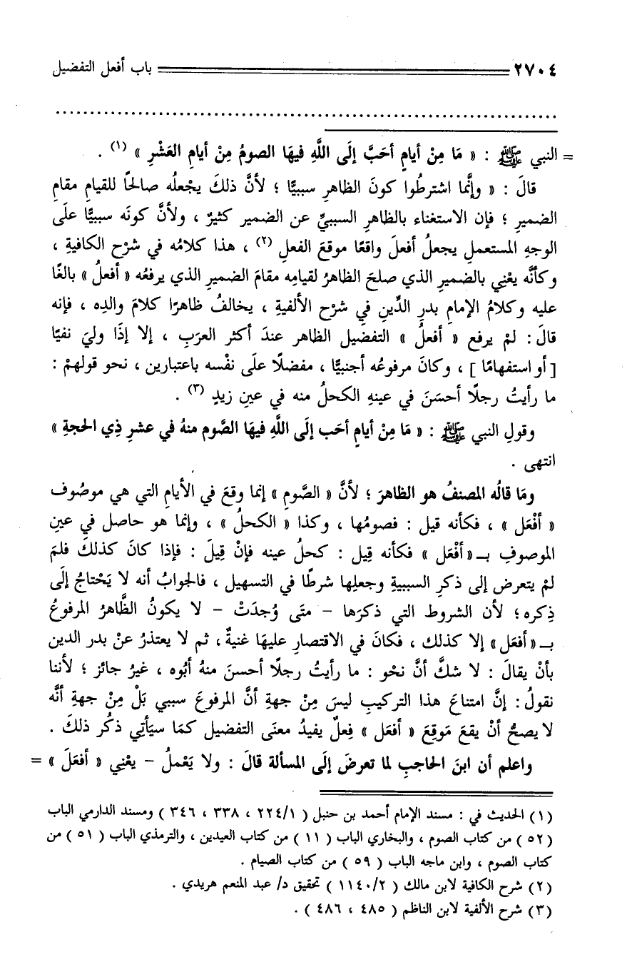وما قاله المصنف هو الظاهر؛ لأنّ «الصّوم» إنما وقع في الأيام التي هي موصوف «أفعل»، فكأنه قيل: فصومها، وكذا «الكحل»، وإنما هو حاصل في عين الموصوف بـ «أفعل» فكأنه قيل: كحل عينه فإن قيل: فإذا كان كذلك فلم لم يتعرض إلى ذكر السببية وجعلها شرطا في التسهيل، فالجواب أنه لا يحتاج إلى ذكره؛ لأن الشروط التي ذكرها - متى وجدت - لا يكون الظّاهر المرفوع بـ «أفعل» إلا كذلك، فكان في الاقتصار عليها غنية، ثم لا يعتذر عن بدر الدين بأن يقال: لا شكّ أنّ نحو: ما رأيت رجلا أحسن منه أبوه، غير جائز؛ لأننا نقول: إنّ امتناع هذا التركيب ليس من جهة أنّ المرفوع سببي بل من جهة أنّه لا يصحّ أن يقع موقع «أفعل» فعل يفيد معنى التفضيل كما سيأتي ذكر ذلك.