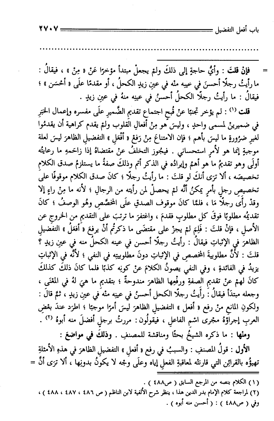 قلت (¬1): لم يؤخر تجنبا عن قبح اجتماع تقديم الضّمير على مفسره وإعمال الخبر في ضميرين لمسمى واحد، وليس هو من أفعال القلوب ولم يقدم كراهية أن يقدموا لغير ضرورة ما ليس بأهم؛ فإن الامتناع من رفع «أفعل» التفضيل الظاهر ليس لعلة موجبة إنما هو لأمر استحساني. فيجوز التخلف عن مقتضاه إذا زاحمه ما رعايته أولى وهو تقديم ما هو أهم وإيراده في الذكر أتم وذلك صفة ما يستلزم صدق الكلام تخصيصه، ألا ترى أنك لو قلت: ما رأيت رجلا؛ كان صدق الكلام موقوفا على تخصيص رجل بأمر يمكن أنّه لم يحصل لمن رأيته من الرجال؛ لأنه ما من راء إلا وقد رأى رجلا ما، فلمّا كان موقوف الصدق على المخصّص وهو الوصف؛ كان تقديمه مطلوبا فوق كل مطلوب فقدم، واغتفر ما ترتب على التقديم من الخروج عن الأصل، فإن قلت: فلم لم يجز على مقتضى ما ذكرتم أن يرفع «أفعل» التفضيل الظاهر في الإثبات فيقال: رأيت رجلا أحسن في عينه الكحل منه في عين زيد؟