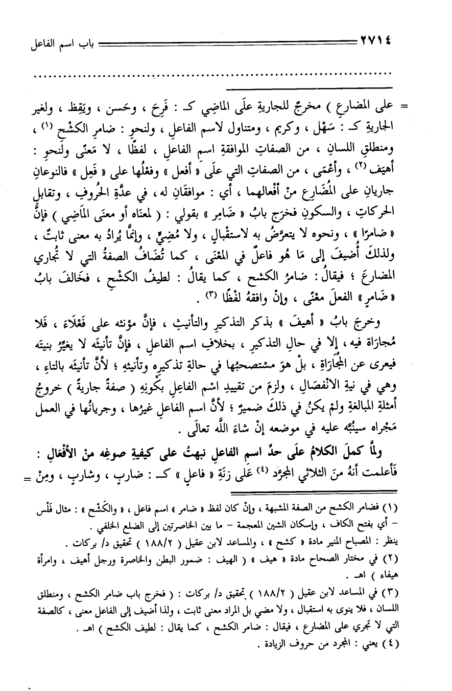 (¬3) في المساعد لابن عقيل (2/ 188) تحقيق د/ بركات: (فخرج باب ضامر الكشح، ومنطلق اللسان، فلا ينوى به استقبال، ولا مضي بل المراد معنى ثابت، ولذا أضيف إلى الفاعل معنى، كالصفة التي لا تجري على المضارع، فيقال: ضامر الكشح، كما يقال: لطيف الكشح) اه.