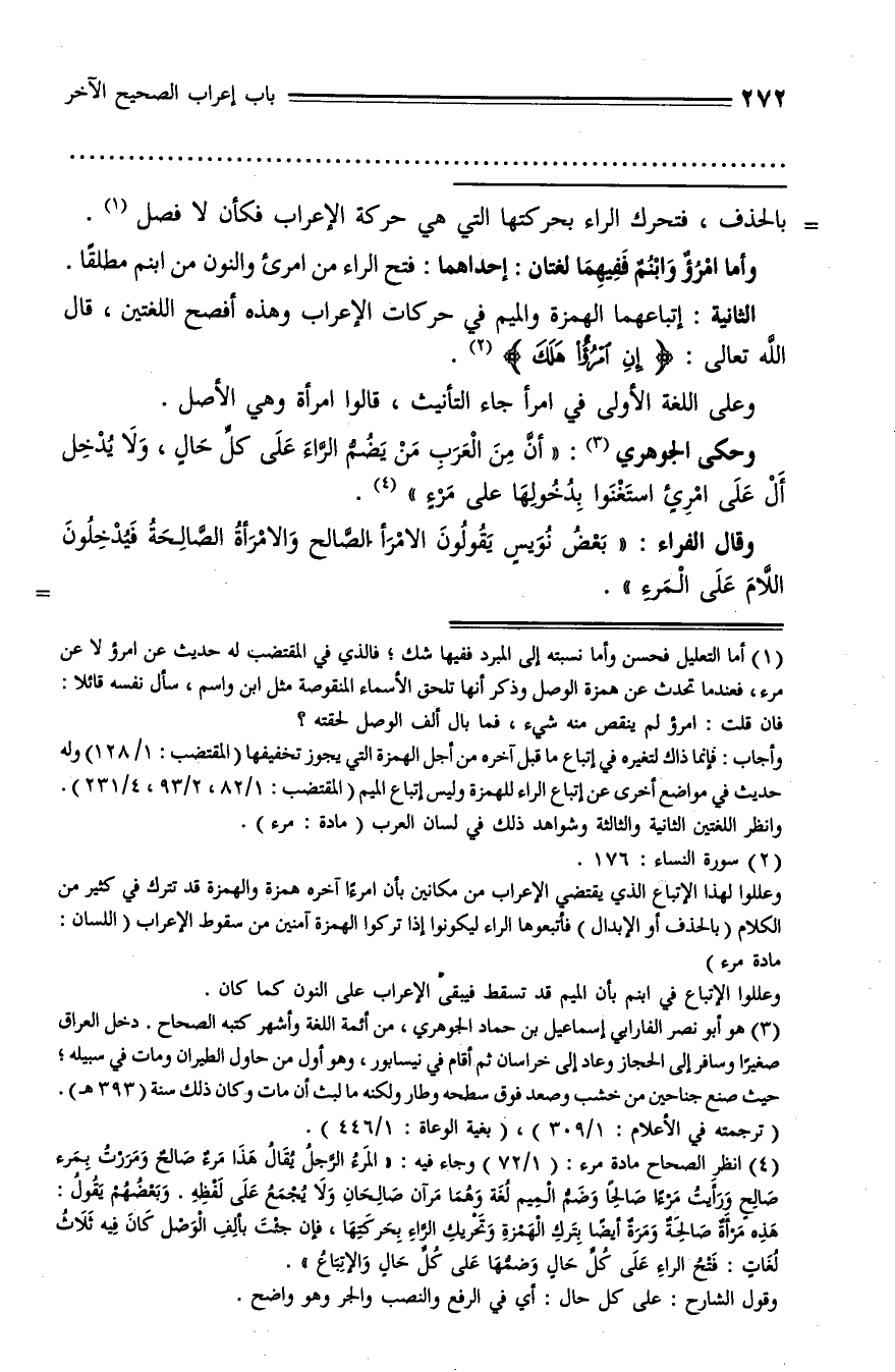 (¬4) انظر الصحاح مادة مرء: (1/ 72) وجاء فيه: «المرء الرّجل يقال هذا مرء صالح ومررت بمرء صالح ورأيت مرءا صالحا وضمّ الميم لغة وهما مرآن صالحان ولا يجمع على لفظه. وبعضهم يقول: