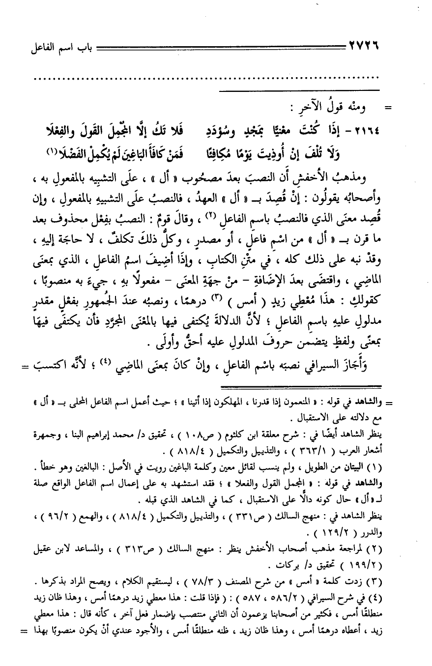 والشاهد في قوله: «المجمل القول والفعلا»؛ فقد استشهد به على إعمال اسم الفاعل الواقع صلة لـ «أل» حال كونه دالّا على الاستقبال، كما في الشاهد الذي قبله.