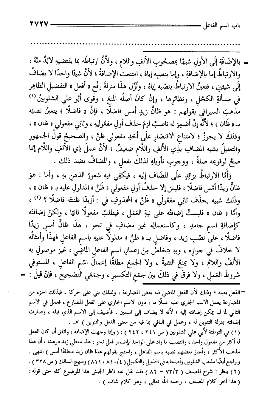 وأمّا الارتباط بزائد على المضاف إليه، فيكفي فيه شعور الذهن به، وأما: هو ظانّ زيدا أمس فاضلا، فليس إلا حذف أول مفعولي «ظنّ» المدلول عليه بـ «ظان»، وذلك شبيه بحذف ثاني مفعولي «ظنّ» المحذوف في: أزيدا ظننته فاضلا؟ (¬2)، وأمّا «ظان» فليست إضافته على نية العمل، فيطلب مفعولا ثانيا، ولكن إضافته كإضافة اسم جامد، وكاستعماله غير مضاف في نحو، هذا ظانّ أمس زيدا فاضلا، على نصب زيد، وفاضل بـ «ظنّ» مدلولا عليه باسم الفاعل فهذا وأمثاله لا خلاف في جوازه، وبه يتخلص من إعمال اسم الفاعل الماضي، غير موصول به الألف واللام، ولا يمنع التثنية، ولا الجمع مطلقا إعمال اسم الفاعل، المستوفي شروط العمل، ولا فرق في ذلك بين جمع التكسير، وجمعي التصحيح، فإن قيل: -