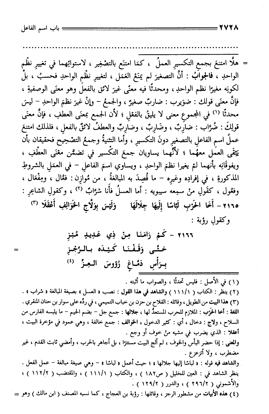 هلّا امتنع بجمع التكسير العمل، كما امتنع بالتصغير، لاستوائهما في تغيير نظم الواحد، فالجواب: أنّ التصغير لم يمنع العمل، لتغيير نظم الواحد فحسب، بلّ لكونه مغيرا نظم الواحد، ومحدثا فيه معنى غير لائق بالفعل وهو معنى الوصفية، فإنّ معنى قولك: ضويرب: ضارب صغير، والجمع - وإن غير نظم الواحد - ليس محدثا (¬1) في المجموع معنى لا يليق بالفعل؛ لأن الجمع بمعنى العطف، فإنّ معنى قولك: ضرّاب: ضارب، وضارب، وضارب والعطف لائق بالفعل، فلذلك امتنع عمل اسم الفاعل بالتصغير دون التكسير، وأما التثنية وجمع التصحيح فحقيقان بأن يبقى العمل معهما؛ لأنّهما يساويان جمع التكسير في تضمّن معنى العطف، ويفوقانه بأنهما لم يغيرا نظم الواحد، ويساوي اسم الفاعل - في العمل بالشروط المذكورة، في إفراده وغيره - ما قصد به المبالغة، من موازن: فعّال، ومفعال، وفعول، كقول من سمعه سيبويه: أما العسل فأنا شرّاب (¬2)، وكقول الشاعر: