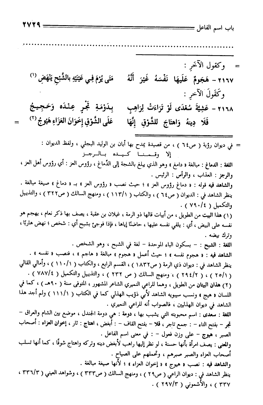 الشاهد فيه: «هجوم نفسه»؛ حيث أعمل «هجوم» مبالغة «هاجم»، فنصب «نفسه».