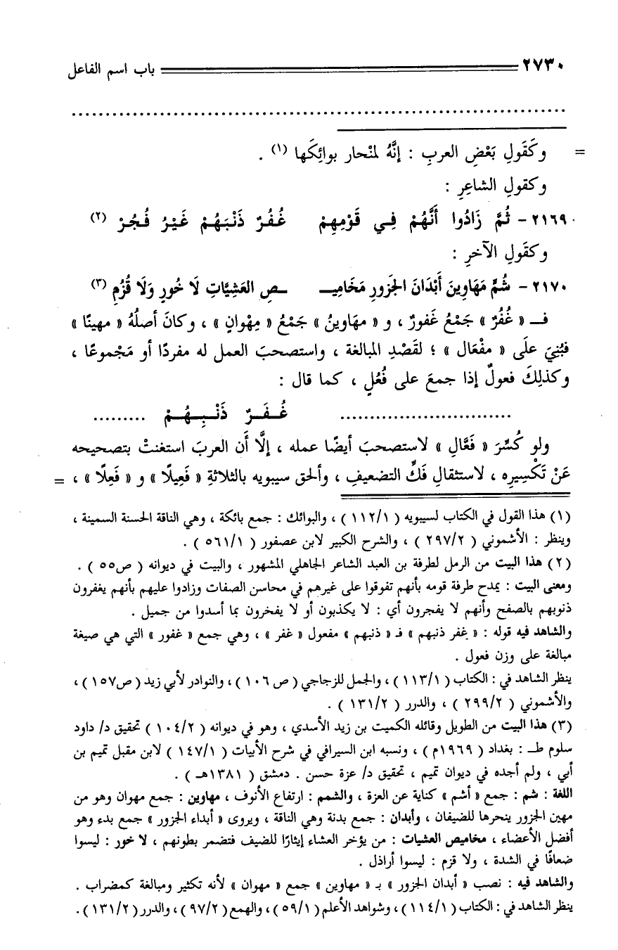 فـ «غفر» جمع غفور، و «مهاوين» جمع «مهوان»، وكان أصله «مهينا» فبني على «مفعال»؛ لقصد المبالغة، واستصحب العمل له مفردا أو مجموعا، وكذلك فعول إذا جمع على فعل، كما قال: