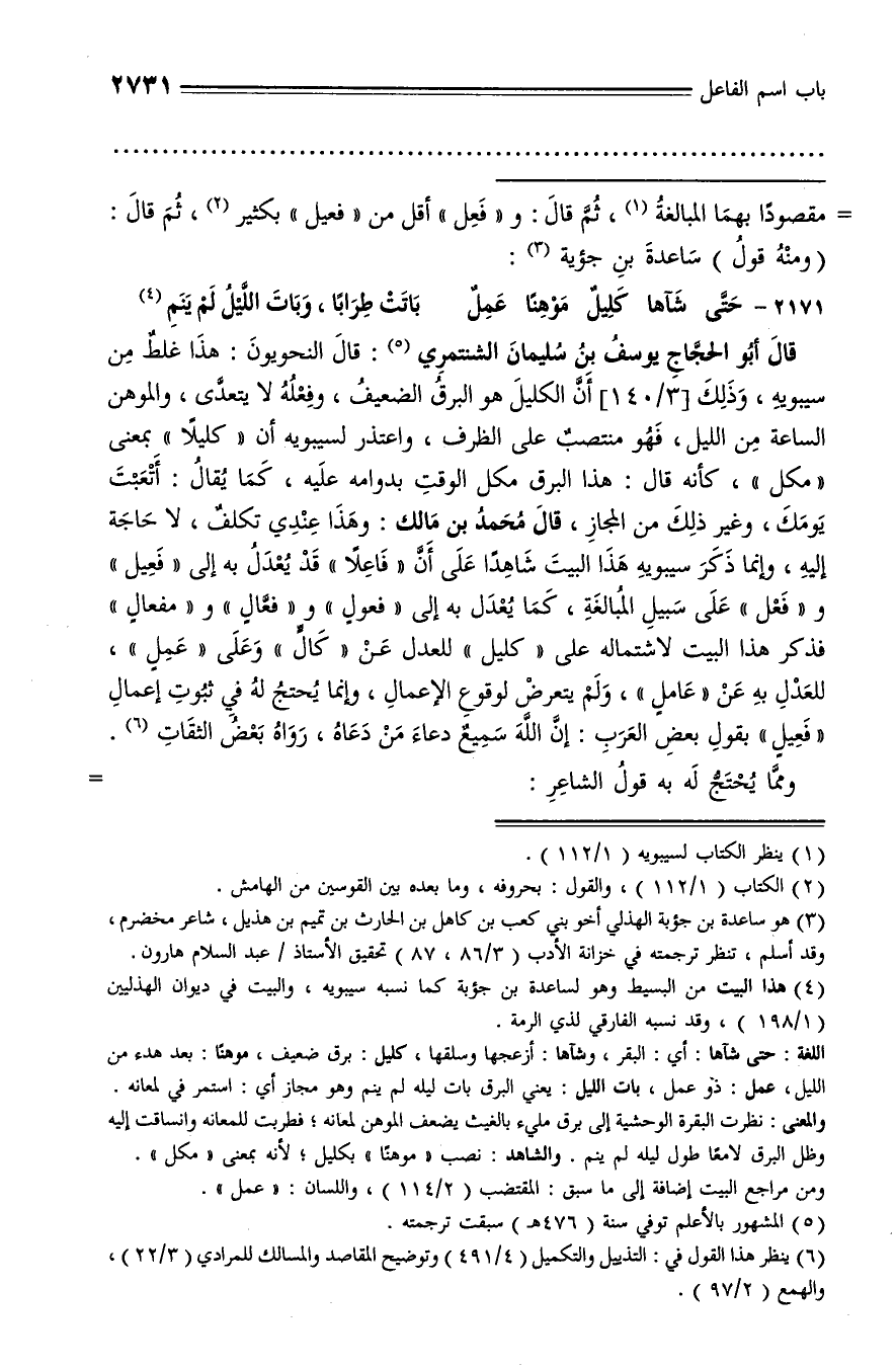 قال أبو الحجّاج يوسف بن سليمان الشنتمري (¬5): قال النحويون: هذا غلط من سيبويه، وذلك [3/ 140] أنّ الكليل هو البرق الضعيف، وفعله لا يتعدّى، والموهن الساعة من الليل، فهو منتصب على الظرف، واعتذر لسيبويه أن «كليلا» بمعنى «مكل»، كأنه قال: هذا البرق مكل الوقت بدوامه عليه، كما يقال: أتعبت يومك، وغير ذلك من المجاز، قال محمد بن مالك: وهذا عندي تكلف، لا حاجة إليه، وإنما ذكر سيبويه هذا البيت شاهدا على أنّ «فاعلا» قد يعدل به إلى «فعيل» و «فعل» على سبيل المبالغة، كما يعدل به إلى «فعول» و «فعّال» و «مفعال» فذكر هذا البيت لاشتماله على «كليل» للعدل عن «كالّ» وعلى «عمل»، للعدل به عن «عامل»، ولم يتعرض لوقوع الإعمال، وإنما يحتج له في ثبوت إعمال «فعيل» بقول بعض العرب: إنّ الله سميع دعاء من دعاه، رواه بعض الثقات (¬6).