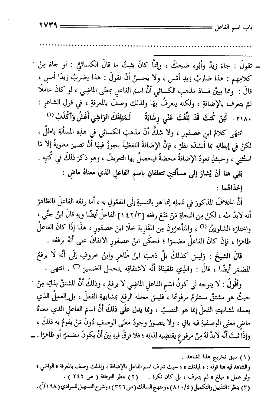 وأقول: لا يتوجه لي كون اسم الفاعل الماضي لا يرفع، وذلك أنّ المشتقّ بذاته من حيث هو مشتق يستلزم مرفوعا، فليس محله الرفع بمشابهة الفعل، بل العمل الذي يعمله لمشابهته الفعل إنما هو النصب، ومما يدل على ذلك أنّ اسم الفاعل الذي معناه ماض معنى الوصفية فيه باق، ولا يتصور وجود معنى الوصف دون من يقوم به ذلك، وإذا ثبت أنّه لا بدّ له من مرفوع يقتضيه لذاته؛ فلا فرق فيه بين أن يكون مضمرا أو ظاهرا. -