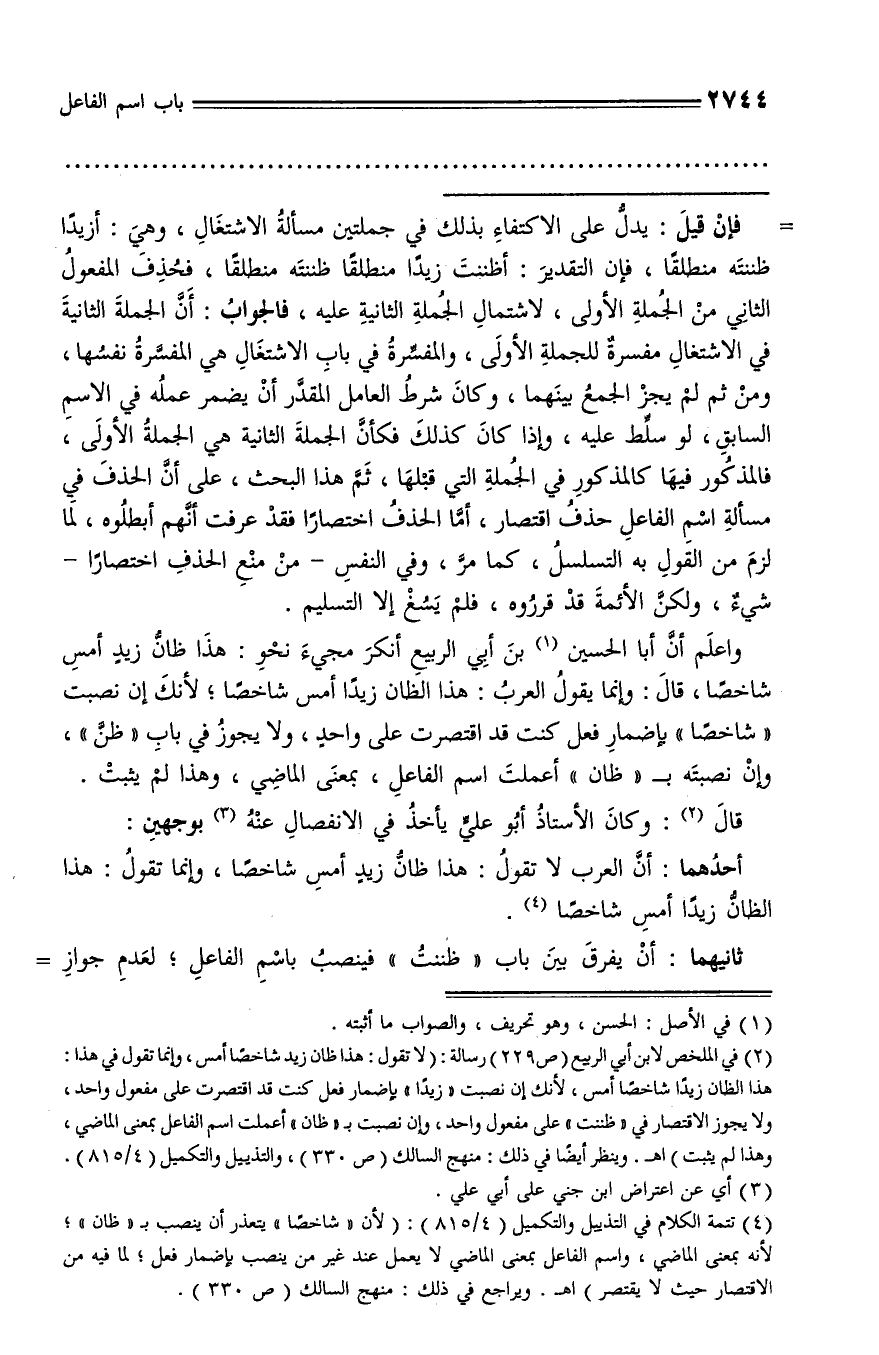 فإن قيل: يدلّ على الاكتفاء بذلك في جملتين مسألة الاشتغال، وهي: أزيدا ظننته منطلقا، فإن التقدير: أظننت زيدا منطلقا ظننته منطلقا، فحذف المفعول الثاني من الجملة الأولى، لاشتمال الجملة الثانية عليه، فالجواب: أنّ الجملة الثانية في الاشتغال مفسرة للجملة الأولى، والمفسّرة في باب الاشتغال هي المفسّرة نفسها، ومن ثم لم يجز الجمع بينهما، وكان شرط العامل المقدّر أن يضمر عمله في الاسم السابق، لو سلّط عليه، وإذا كان كذلك فكأنّ الجملة الثانية هي الجملة الأولى، فالمذكور فيها كالمذكور في الجملة التي قبلها، ثمّ هذا البحث، على أنّ الحذف في مسألة اسم الفاعل حذف اقتصار، أمّا الحذف اختصارا فقد عرفت أنّهم أبطلوه، لما لزم من القول به التسلسل، كما مرّ، وفي النفس - من منع الحذف اختصارا - شيء، ولكنّ الأئمة قد قرروه، فلم يسغ إلا التسليم.