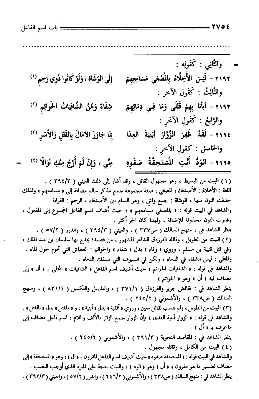 والشاهد في قوله: «الشافيات الحوائم» حيث أضيف اسم الفاعل «الشافيات» المحلى بـ «أل» إلى مضاف فيه «أل» وهو «الحوائم».