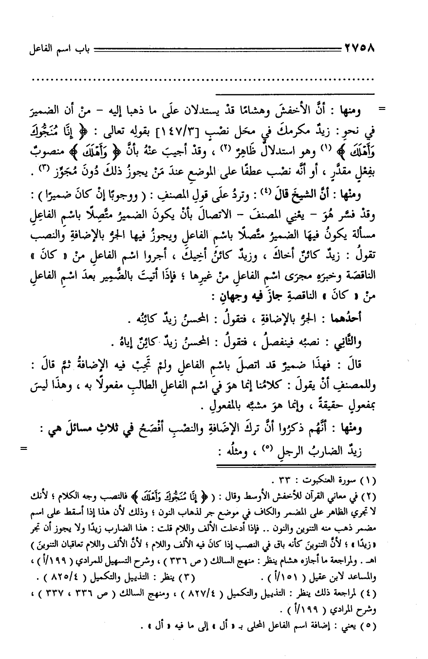 (¬2) في معاني القرآن للأخفش الأوسط وقال: (إِنَّا مُنَجُّوكَ وَأَهْلَكَ فالنصب وجه الكلام؛ لأنك لا تجري الظاهر على المضمر والكاف في موضع جر لذهاب النون؛ وذلك لأن هذا إذا أسقط على اسم مضمر ذهب منه التنوين والنون .. فإذا أدخلت الألف واللام قلت: هذا الضارب زيدا ولا يجوز أن تجر «زيدا»؛ لأنّ التنوين كأنه باق في النصب إذا كان فيه الألف واللام؛ لأنّ الألف واللام تعاقبان التنوين) اه. ولمراجعة ما أجازه هشام ينظر: منهج السالك (ص 336)، وشرح التسهيل للمرادي (199 / أ)، والمساعد لابن عقيل (151 / أ).
