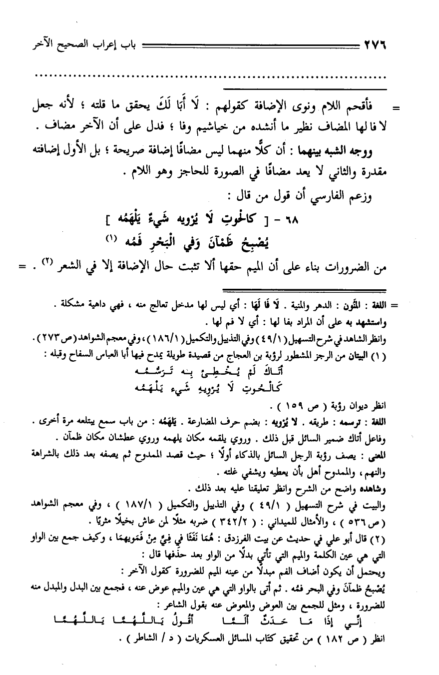 يصبح ظمآن وفي البحر فمه. ثم أتى بالواو التي هي عين والميم عوض عنه، فجمع بين البدل والمبدل منه للضرورة، ومثل للجمع بين العوض والمعوض عنه بقول الشاعر: