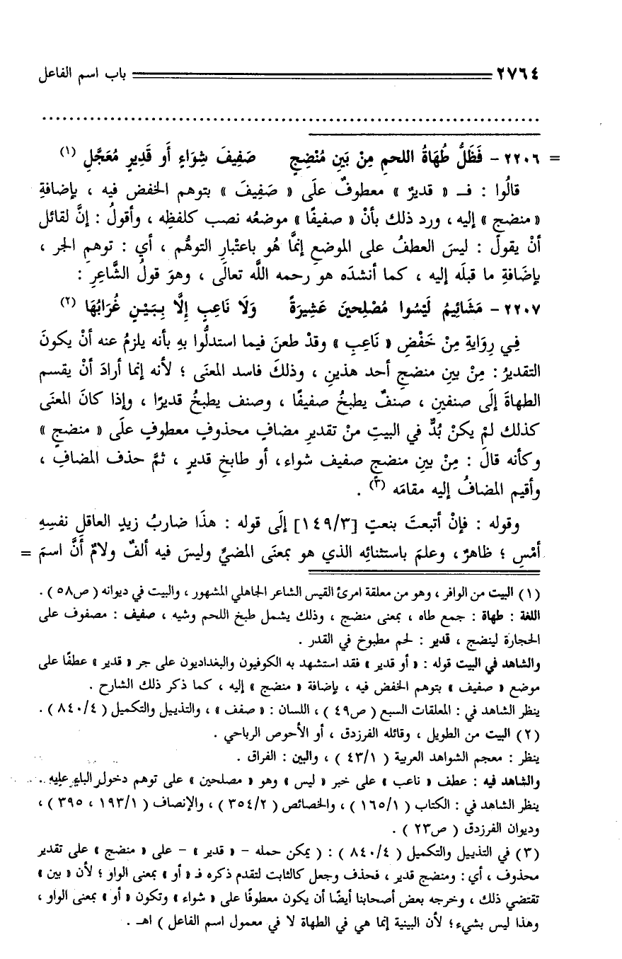 في رواية من خفض «ناعب» وقد طعن فيما استدلّوا به بأنه يلزم عنه أن يكون التقدير: من بين منضج أحد هذين، وذلك فاسد المعنى؛ لأنه إنما أراد أن يقسم الطهاة إلى صنفين، صنف يطبخ صفيفا، وصنف يطبخ قديرا، وإذا كان المعنى كذلك لم يكن بدّ في البيت من تقدير مضاف محذوف معطوف على «منضج» وكأنه قال: من بين منضج