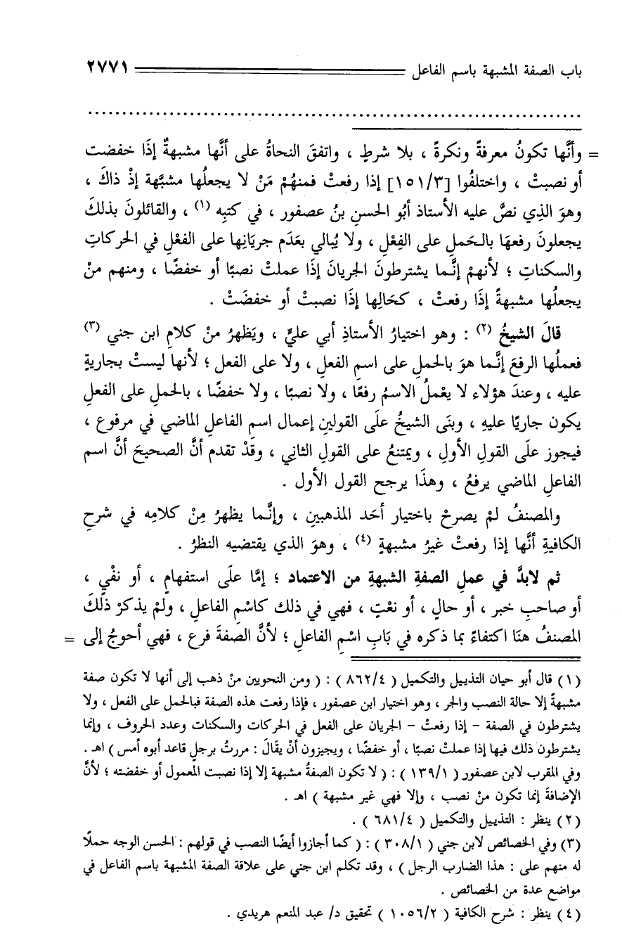 (¬1) قال أبو حيان التذييل والتكميل (4/ 862): (ومن النحويين من ذهب إلى أنها لا تكون صفة مشبهة إلا حالة النصب والجر، وهو اختيار ابن عصفور، فإذا رفعت هذه الصفة فبالحمل على الفعل، ولا يشترطون في الصفة - إذا رفعت - الجريان على الفعل في الحركات والسكنات