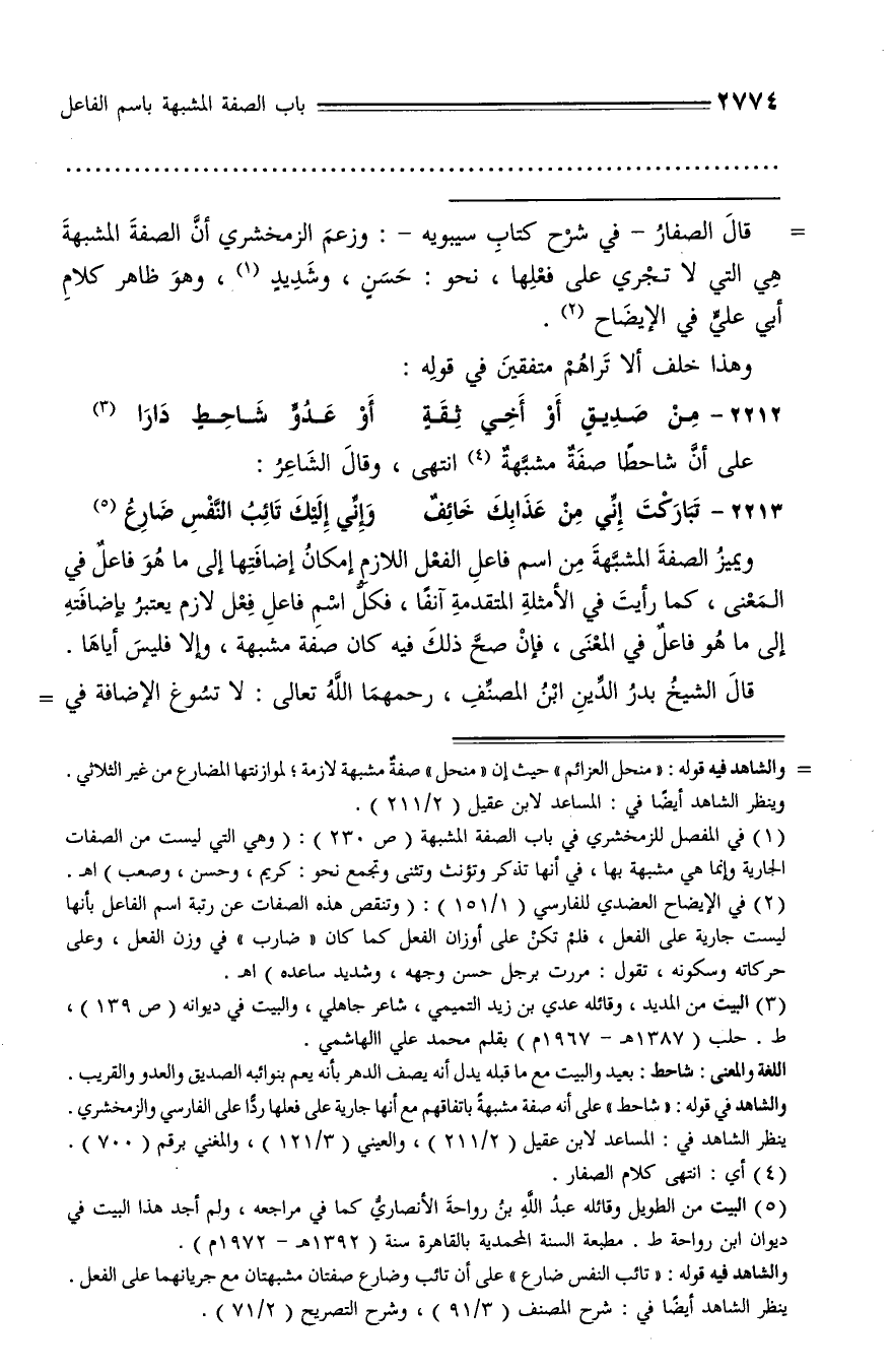 (¬2) في الإيضاح العضدي للفارسي (1/ 151): (وتنقص هذه الصفات عن رتبة اسم الفاعل بأنها ليست جارية على الفعل، فلم تكن على أوزان الفعل كما كان «ضارب» في وزن الفعل، وعلى حركاته وسكونه، تقول: مررت برجل حسن وجهه، وشديد ساعده) اهـ.