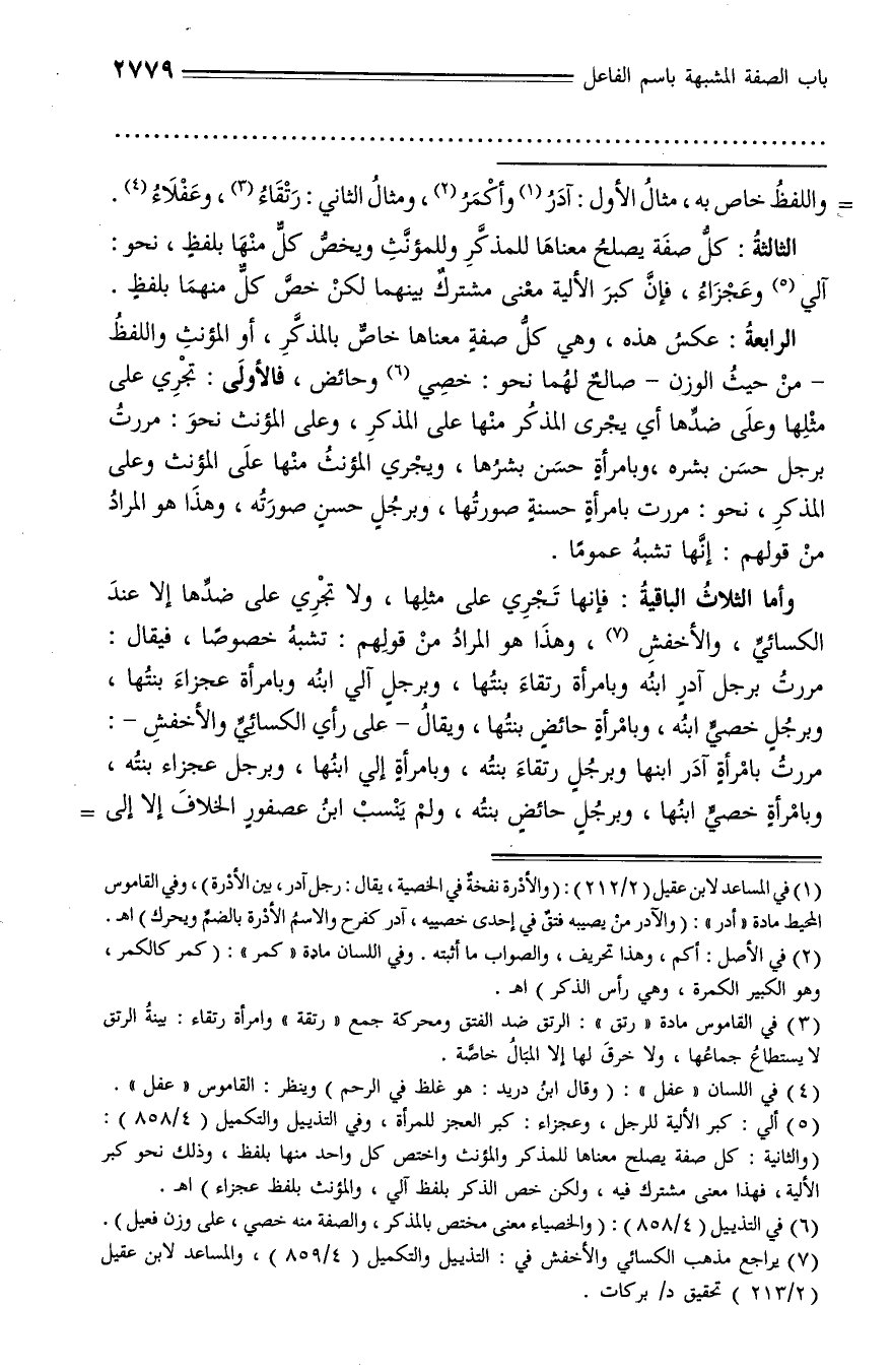 واللفظ خاص به، مثال الأول: آدر (¬1) وأكمر (¬2)، ومثال الثاني: رتقاء (¬3)، وعفلاء (¬4).
