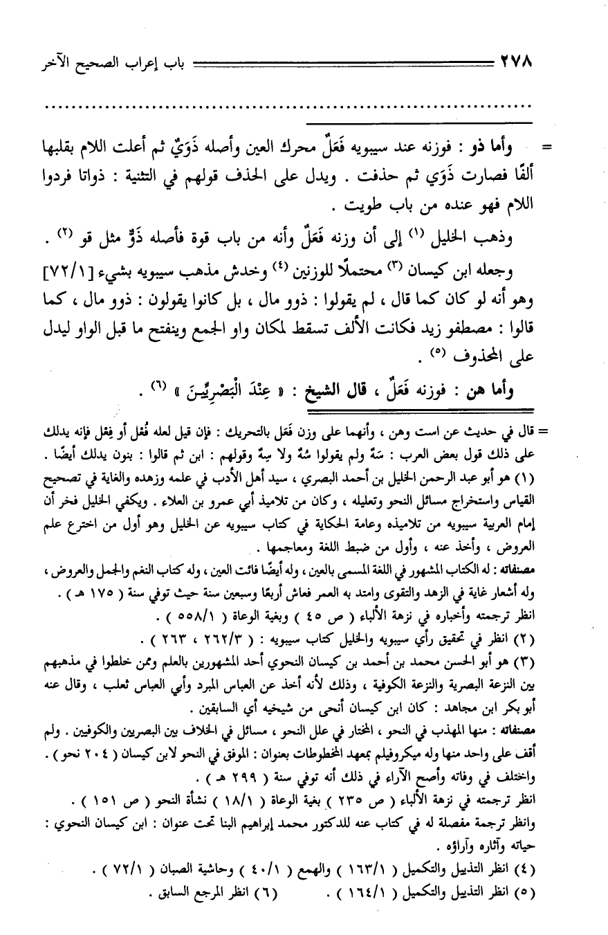 وجعله ابن كيسان (¬3) محتملا للوزنين (¬4) وخدش مذهب سيبويه بشيء [1/ 72] وهو أنه لو كان كما قال، لم يقولوا: ذوو مال، بل كانوا يقولون: ذوو مال، كما قالوا: مصطفو زيد فكانت الألف تسقط لمكان واو الجمع وينفتح ما قبل الواو ليدل على المحذوف (¬5).