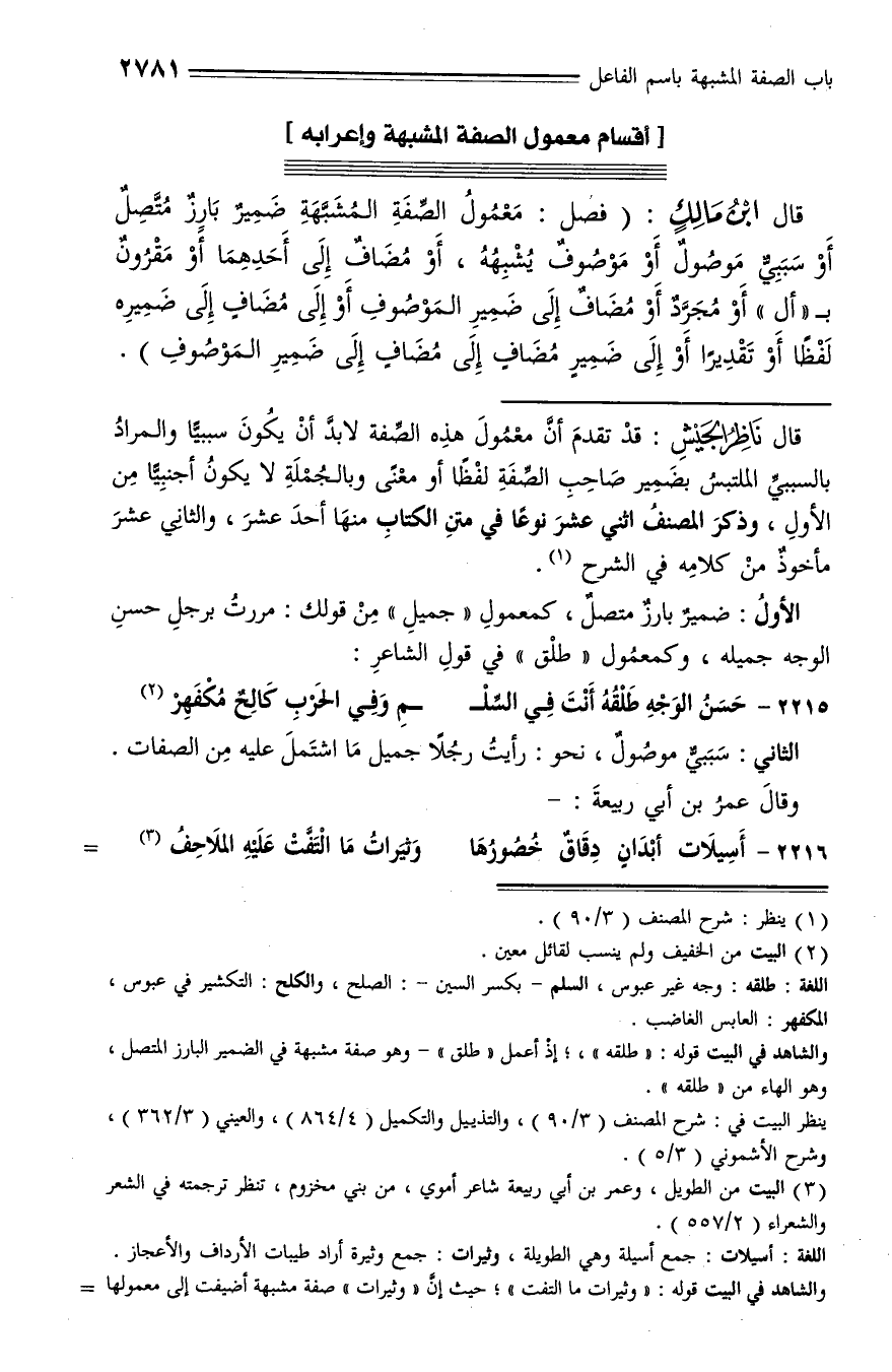 قال ابن مالك: (فصل: معمول الصّفة المشبّهة ضمير بارز متّصل أو سببيّ موصول أو موصوف يشبهه، أو مضاف إلى أحدهما أو مقرون بـ «أل» أو مجرّد أو مضاف إلى ضمير الموصوف أو إلى مضاف إلى ضميره لفظا أو تقديرا أو إلى ضمير مضاف إلى مضاف إلى ضمير الموصوف).