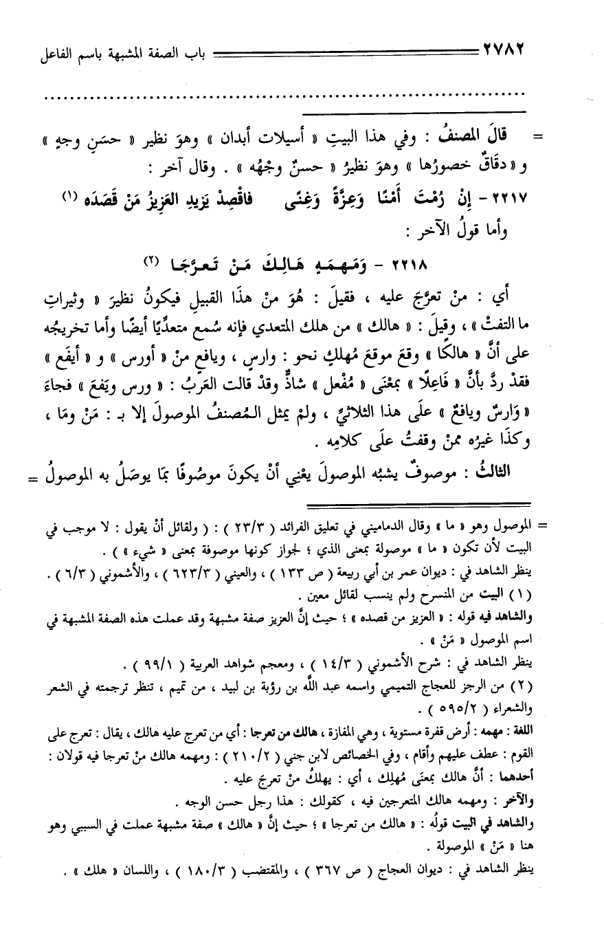 والشاهد في البيت قوله: «هالك من تعرجا»؛ حيث إنّ «هالك» صفة مشبهة عملت في السببي وهو هنا «من» الموصولة.