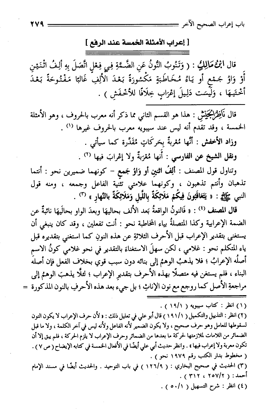 قال ناظر الجيش: هذا هو القسم الثاني مما ذكر أنه معرب بالحروف، وهو الأمثلة الخمسة، وقد تقدم أنه ليس عند سيبويه معرب بالحروف غيرها (¬1).