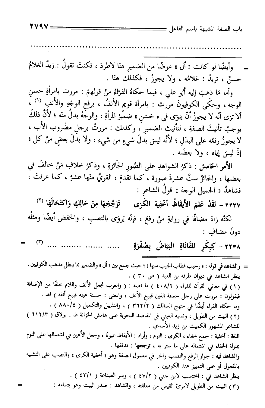 الأمر الخامس: ذكر الشواهد على الصّور الجائزة، وذكر خلاف من خالف في بعضها، والجائز ستّ عشرة صورة، كما تقدم، القويّ منها عشر، كما عرفت، فشاهد «الجميل الوجه» قول الشاعر: