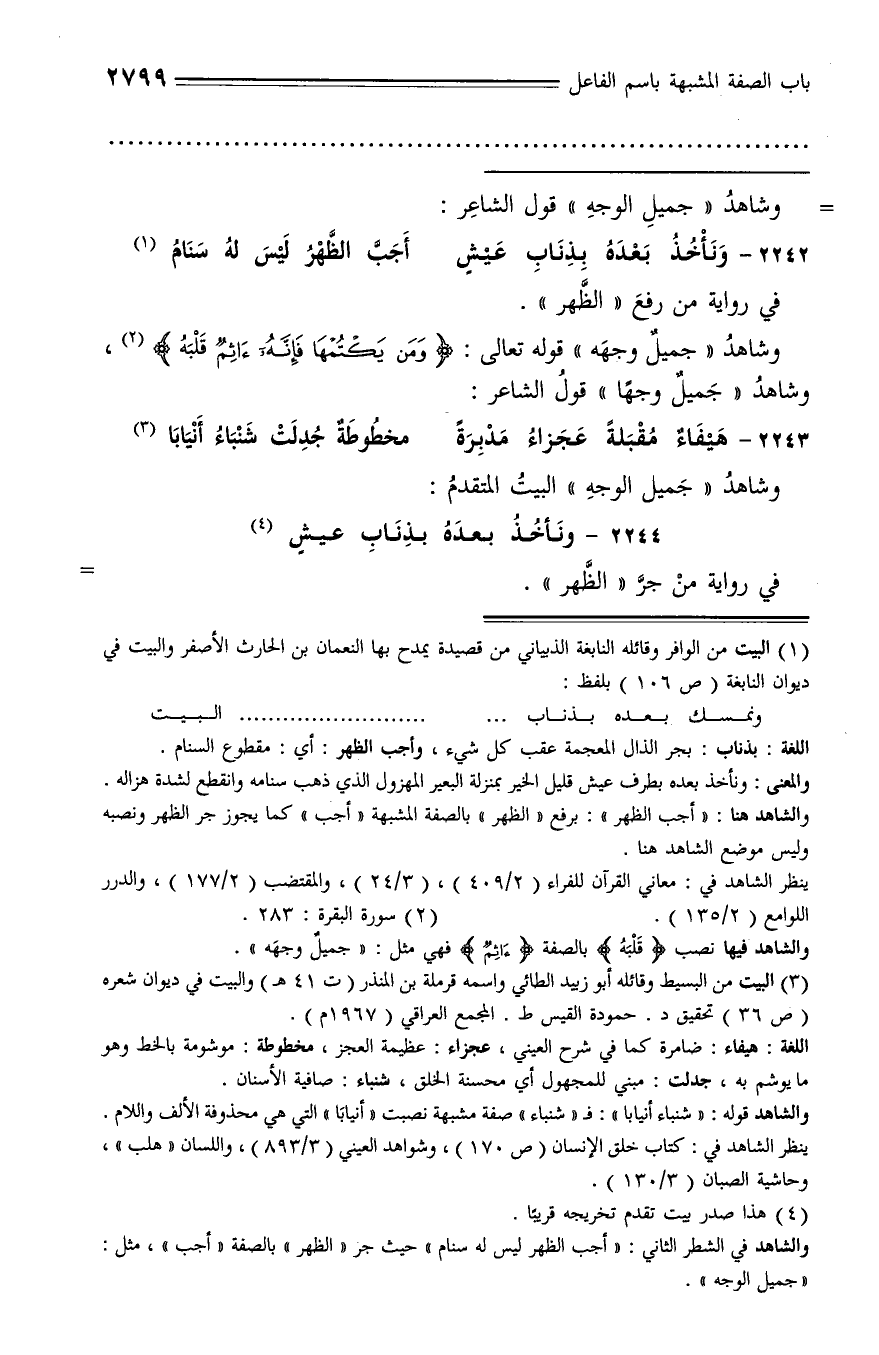 (¬3) البيت من البسيط وقائله أبو زبيد الطائي واسمه قرملة بن المنذر (ت 41 هـ) والبيت في ديوان شعره (ص 36) تحقيق د. حمودة القيس ط. المجمع العراقي (1967 م).