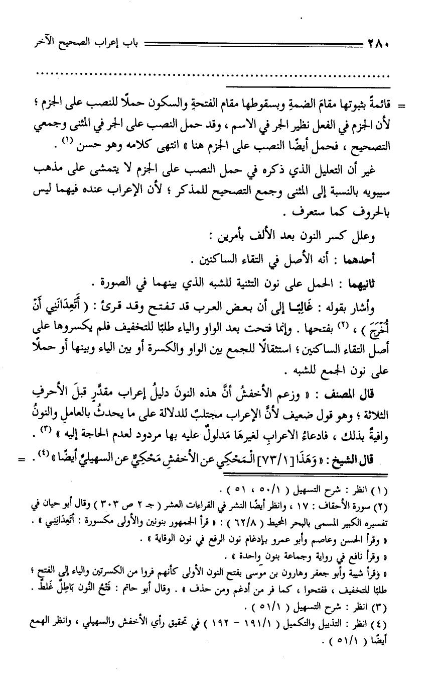 قال المصنف: «وزعم الأخفش أنّ هذه النون دليل إعراب مقدّر قبل الأحرف الثلاثة؛ وهو قول ضعيف لأنّ الإعراب مجتلب للدلالة على ما يحدث بالعامل والنون وافية بذلك، فادعاء الاعراب لغيرها مدلول عليه بها مردود لعدم الحاجة إليه» (¬3).