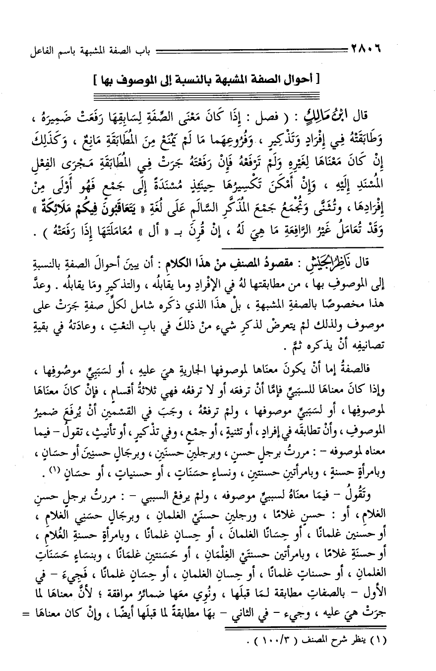 قال ناظر الجيش: مقصود المصنف من هذا الكلام: أن يبين أحوال الصفة بالنسبة إلى الموصوف بها، من مطابقتها له في الإفراد وما يقابله، والتذكير وما يقابله. وعدّ هذا مخصوصا بالصفة المشبهة، بل هذا الذي ذكره شامل لكلّ صفة جرت على موصوف ولذلك لم يتعرض لذكر شيء من ذلك في باب النعت، وعادته في بقية تصانيفه أن يذكره ثمّ.