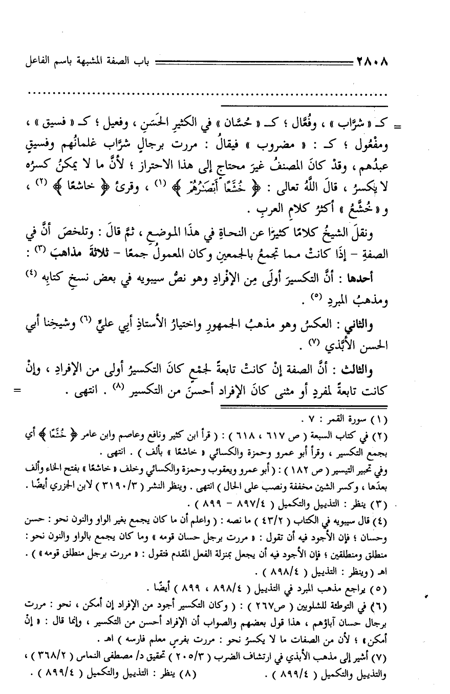 والثالث: أنّ الصفة إن كانت تابعة لجمع كان التكسير أولى من الإفراد، وإن كانت تابعة لمفرد أو مثنى كان الإفراد أحسن من التكسير (¬8). انتهى. -