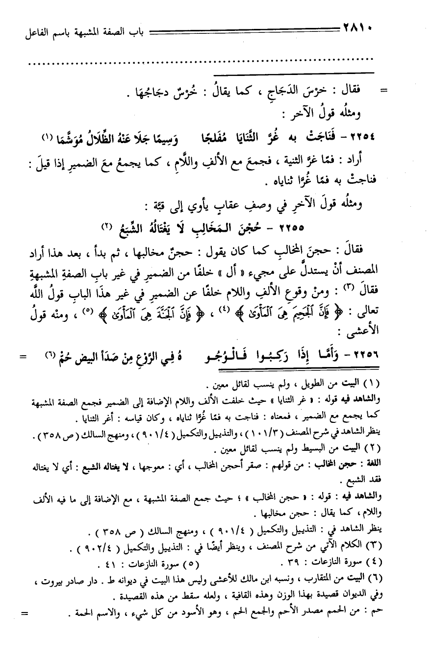 (¬6) البيت من المتقارب، ونسبه ابن مالك للأعشى وليس هذا البيت في ديوانه ط. دار صادر بيروت، وفي الديوان قصيدة بهذا الوزن وهذه القافية، ولعله سقط من هذه القصيدة.