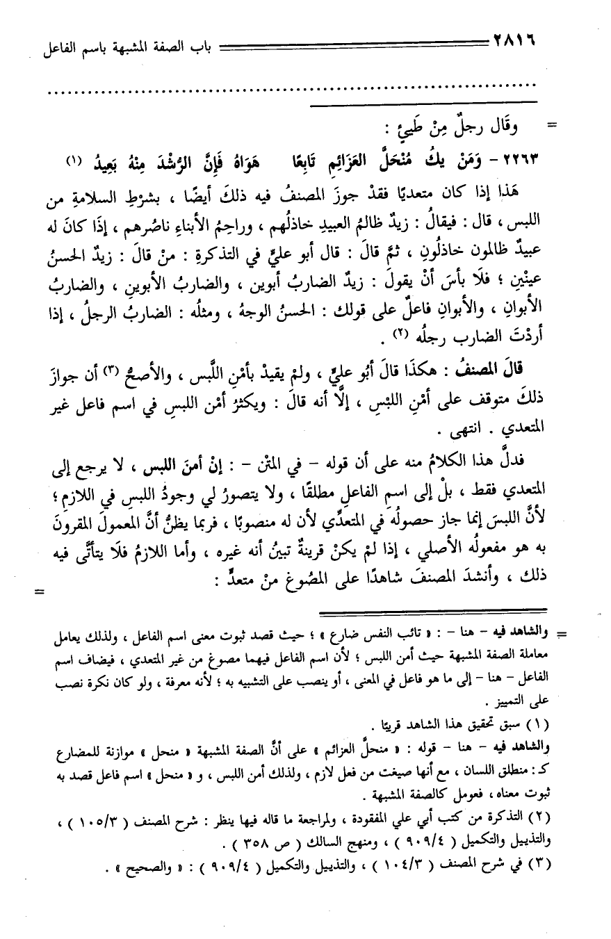 - والشاهد فيه - هنا -: «تائب النفس ضارع»؛ حيث قصد ثبوت معنى اسم الفاعل، ولذلك يعامل معاملة الصفة المشبهة حيث أمن اللبس؛ لأن اسم الفاعل فيهما مصوغ من غير المتعدي، فيضاف اسم الفاعل - هنا - إلى ما هو فاعل في المعنى، أو ينصب على التشبيه به؛ لأنه معرفة، ولو كان نكرة نصب على التمييز.