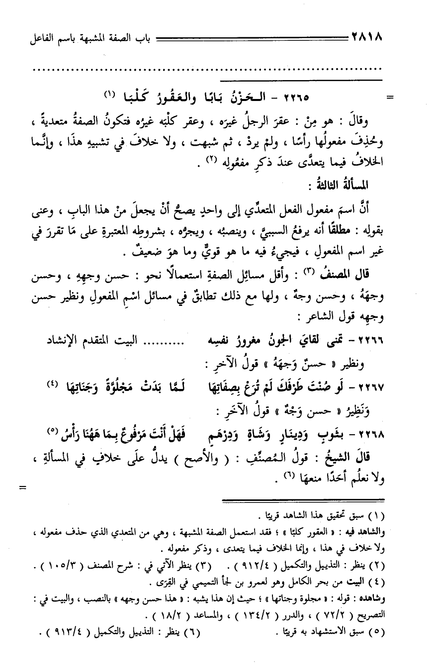 والشاهد فيه: «العقور كلبا»؛ فقد استعمل الصفة المشبهة، وهي من المتعدي الذي حذف مفعوله، ولا خلاف في هذا، وإنما الخلاف فيما يتعدى، وذكر مفعوله.