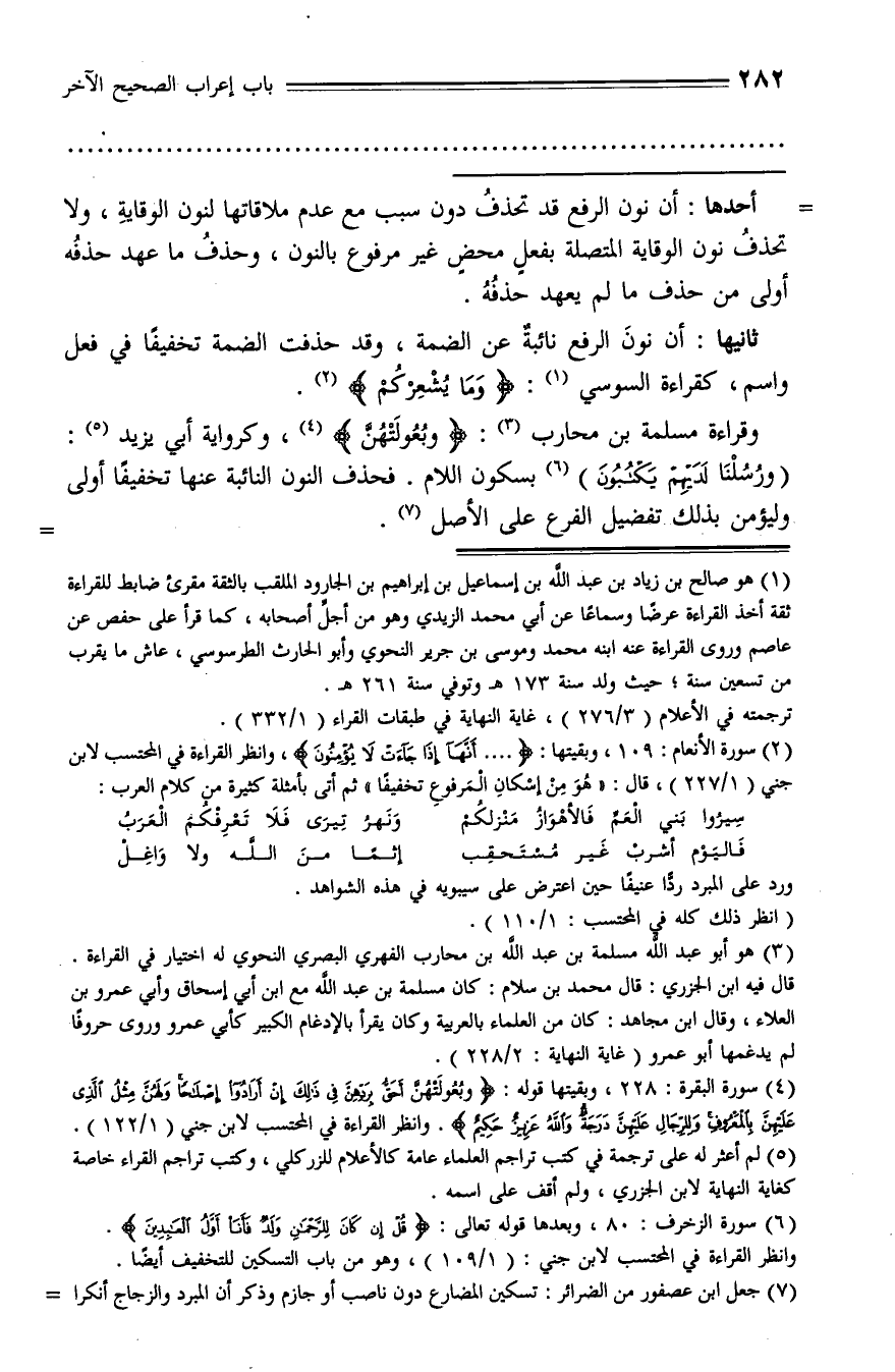 (¬2) سورة الأنعام: 109، وبقيتها: ... أَنَّها إِذا جاءَتْ لا يُؤْمِنُونَ، وانظر القراءة في المحتسب لابن جني (1/ 227)، قال: «هو من إسكان المرفوع تخفيفا» ثم أتى بأمثلة كثيرة من كلام العرب: