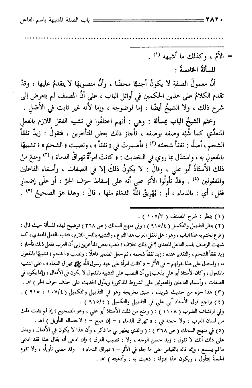 (¬5) في منهج السالك (ص 368): (والذي يظهر لي ما ذكر، وأن هذا لا يكون في الأفعال، ويدل على ذلك أنك لا تقول: زيد حسن الوجه، ولا: تصبب العرق؛ فإن ادعى أنه يقال هذا فقد ادعى ما لم يسمع، وإنما قاله بالقياس على ما جاء في الأثر - «تهراق الدماء» - وقد مضى تأويله، ولا تقوم الحجة بمتأول، ويكون هذا بمنزلة: ذهبت به، وأذهبته) اهـ.