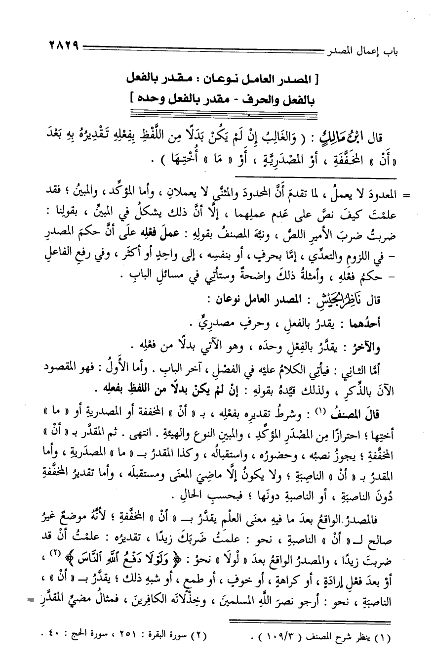 فالمصدر الواقع بعد ما فيه معنى العلم يقدّر بـ «أن» المخفّفة؛ لأنّه موضع غير صالح لـ «أن» الناصبة، نحو: علمت ضربك زيدا، تقديره: علمت أن قد ضربت زيدا، والمصدر الواقع بعد «لولا» نحو: وَلَوْلا دَفْعُ اللَّهِ النَّاسَ * (¬2)، أو بعد فعل إرادة، أو كراهة، أو خوف، أو طمع، أو شبه ذلك؛ يقدّر بـ «أن»، الناصبة، نحو: أرجو نصر الله المسلمين،