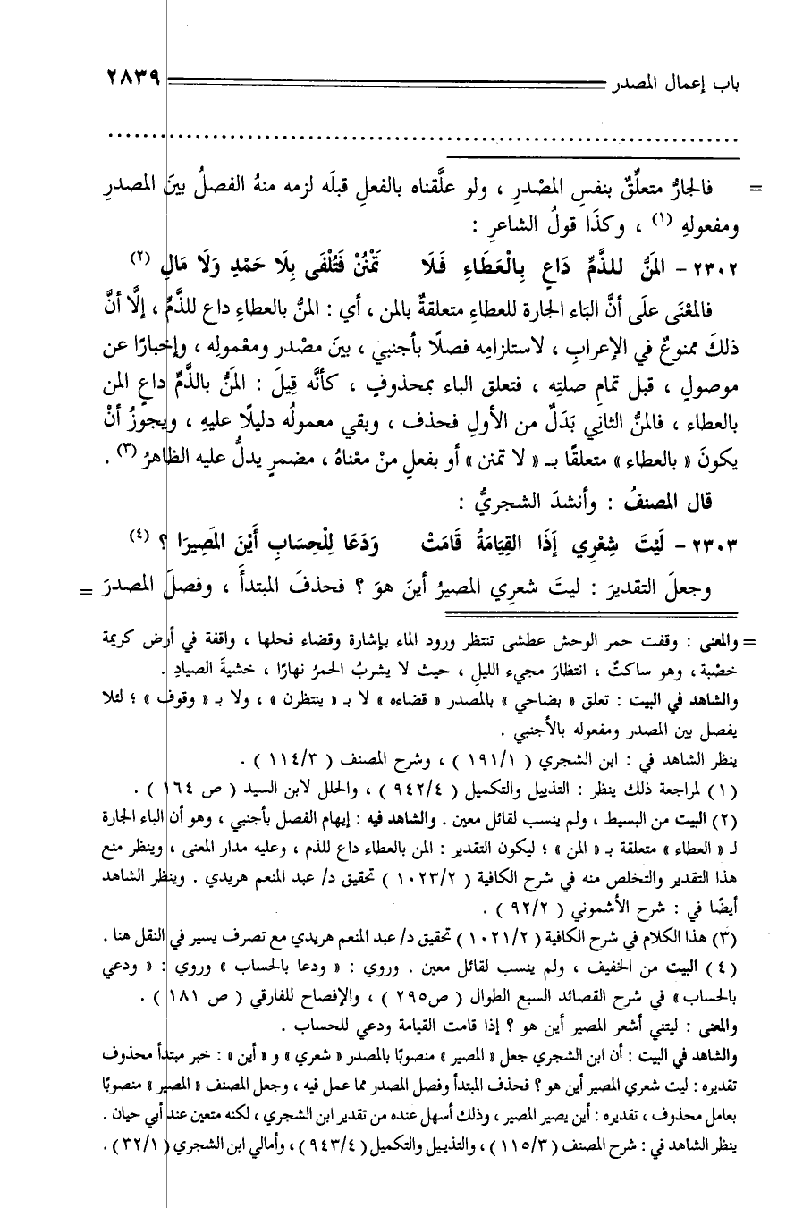 (¬2) البيت من البسيط، ولم ينسب لقائل معين. والشاهد فيه: إيهام الفصل بأجنبي، وهو أن الباء الجارة لـ «العطاء» متعلقة بـ «المن»؛ ليكون التقدير: المن بالعطاء داع للذم، وعليه مدار المعنى، وينظر منع هذا التقدير والتخلص منه في شرح الكافية (2/ 1023) تحقيق د/ عبد المنعم هريدي. وينظر الشاهد أيضا في: شرح الأشموني (2/ 92).