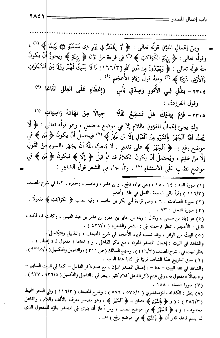 (¬8) ينظر: الكشاف للزمخشري (1/ 575، 576)، وشرح المصنف (3/ 116) وفي البحر المحيط (3/ 382): (و (بالسوء) متعلق بـ (الجهر،) وهو مصدر معرف بالألف واللام، والفاعل محذوف، وب (الجهر) في موضع نصب، ومن أجاز أن ينوى في المصدر بناؤه للمفعول الذي لم يسم فاعله قدر أن (بالسوء) في موضع رفع) اهـ.