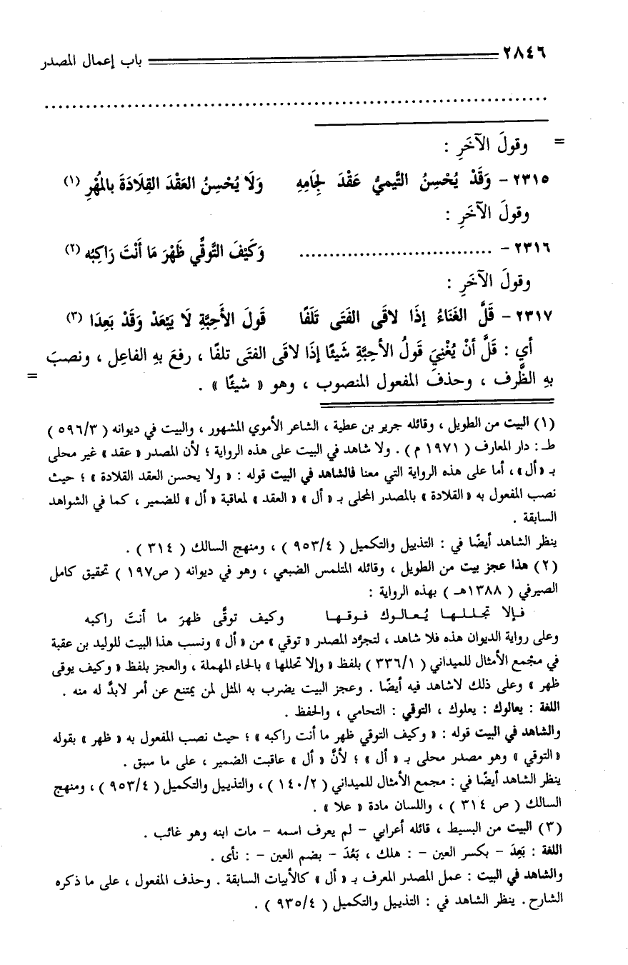 (¬1) البيت من الطويل، وقائله جرير بن عطية، الشاعر الأموي المشهور، والبيت في ديوانه (3/ 596) ط: دار المعارف (1971 م). ولا شاهد في البيت على هذه الرواية؛ لأن المصدر «عقد» غير محلى بـ «أل»، أما على هذه الرواية التي معنا فالشاهد في البيت قوله: «ولا يحسن العقد القلادة»؛ حيث نصب المفعول به «القلادة» بالمصدر المحلى بـ «أل» «العقد» لمعاقبة «أل» للضمير، كما في الشواهد السابقة.