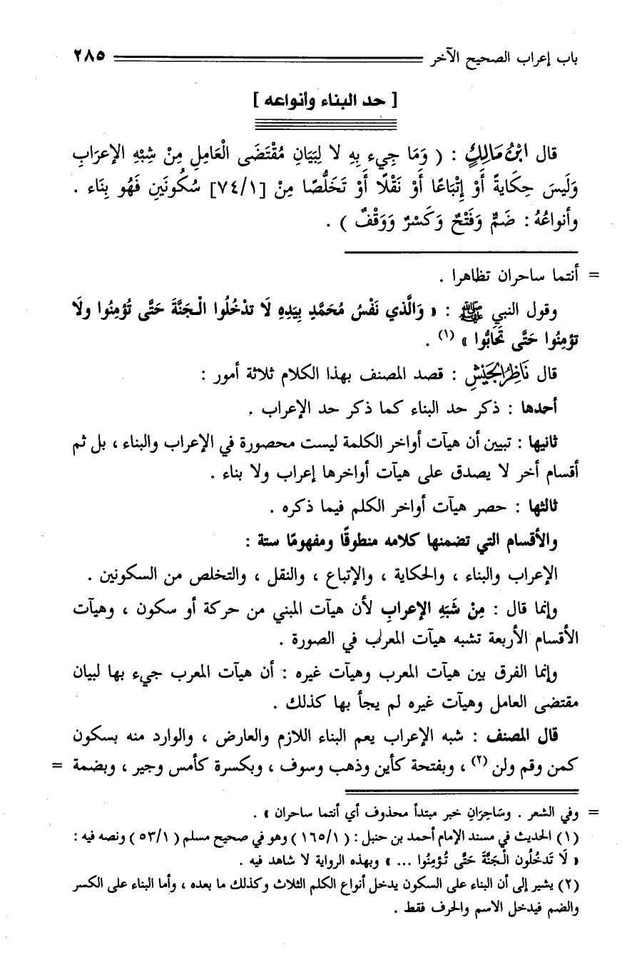 (¬2) يشير إلى أن البناء على السكون يدخل أنواع الكلم الثلاث وكذلك ما بعده، وأما البناء على الكسر والضم فيدخل الاسم والحرف فقط.