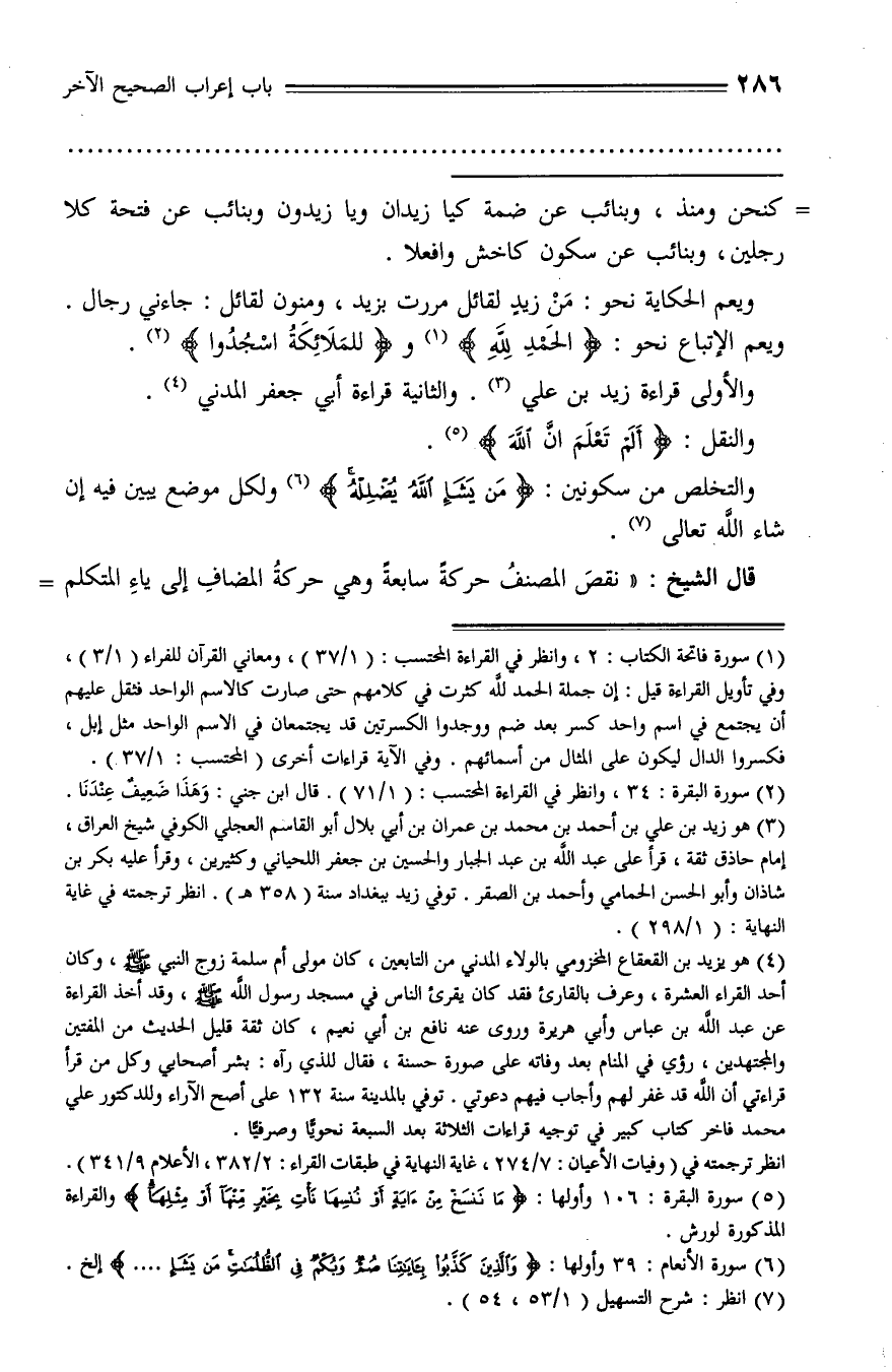 (¬4) هو يزيد بن القعقاع المخزومي بالولاء المدني من التابعين، كان مولى أم سلمة زوج النبي صلّى الله عليه وسلّم، وكان أحد القراء العشرة، وعرف بالقارئ فقد كان يقرئ الناس في مسجد رسول الله صلّى الله عليه وسلّم، وقد أخذ القراءة عن عبد الله بن عباس وأبي هريرة وروى عنه نافع بن أبي نعيم، كان ثقة قليل الحديث من المفتين والمجتهدين، رؤي في المنام بعد وفاته على صورة حسنة، فقال للذي رآه: بشر أصحابي وكل من قرأ قراءتي أن الله قد غفر لهم وأجاب فيهم دعوتي. توفي بالمدينة سنة 132 على أصح الآراء وللدكتور علي محمد فاخر كتاب كبير في توجيه قراءات الثلاثة بعد السبعة نحويّا وصرفيّا.